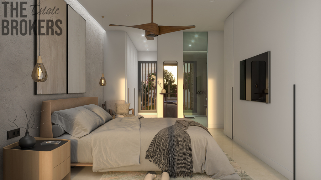 Přízemí: Zahrnuje prostornou dvoulůžkovou ložnici s koupelnou en-suite a soukromou terasou. Obývací a jídelní prostory v otevřeném plánu navazují na sluncem zalité terasy. Stylová kuchyně je vyrobena z prémiových materiálů.