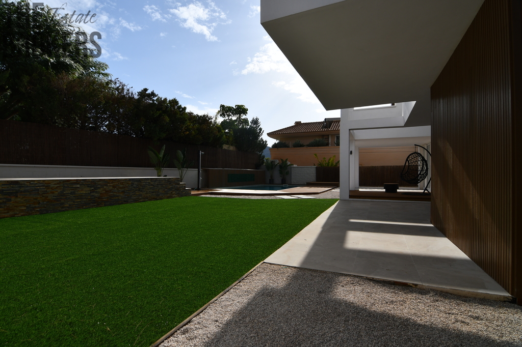 Venkovní oáza s nádherným bazénem s porcelánovými dlaždicemi, vodopádem, krytou terasou s kompletní kuchyní a ohništěm.