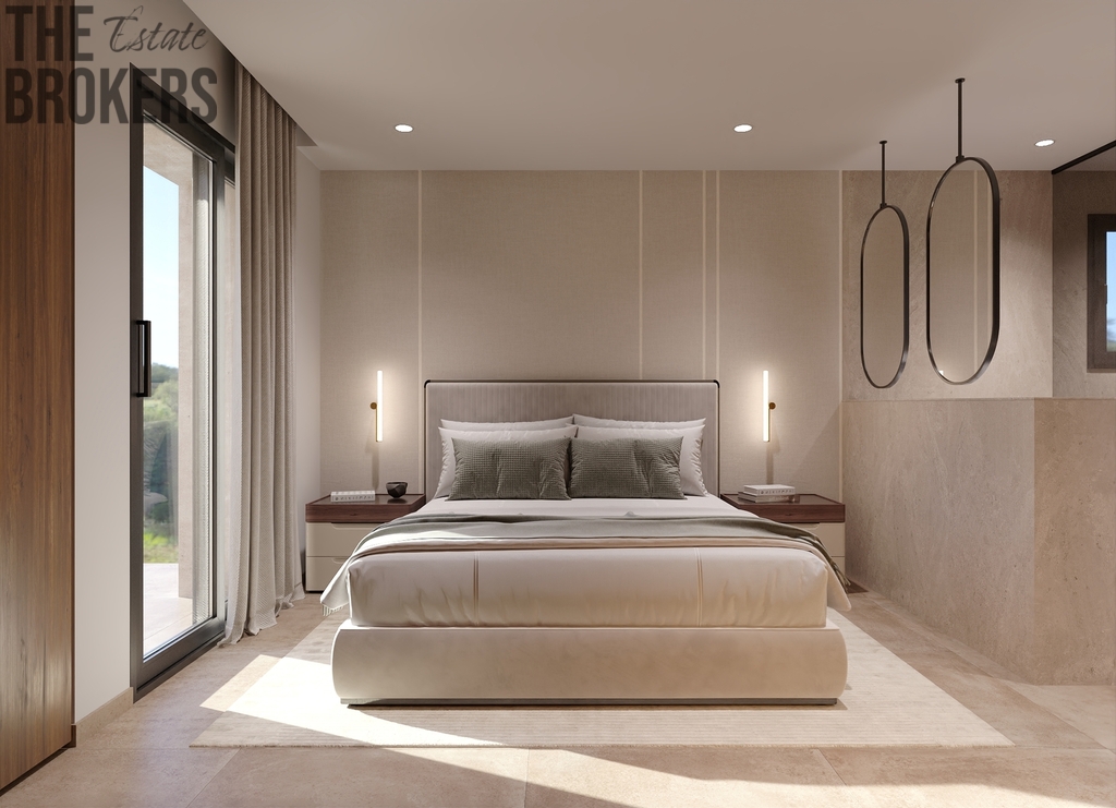 Přízemí: Zahrnuje prostornou dvoulůžkovou ložnici s koupelnou en-suite a soukromou terasou. Otevřené obývací a jídelní prostory vedou na venkovní terasy.