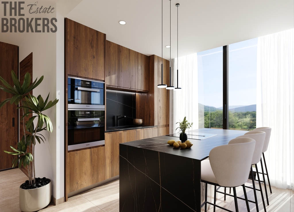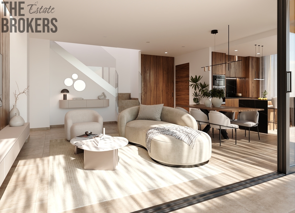 Přízemí: Zahrnuje obývací a jídelní prostor v otevřeném plánu, který navazuje na rozlehlé terasy, ideální pro bydlení uvnitř i venku.