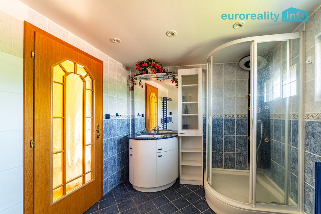 Součástí nemovitosti jsou dvě zachovalé kuchyně s vestavěnými spotřebiči a dvě koupelny vybavené hydromasážní vanou. V přízemí se nachází prostorná společenská místnost s barem, zázemím a krbem, který podtrhuje jedinečnou atmosféru domu.