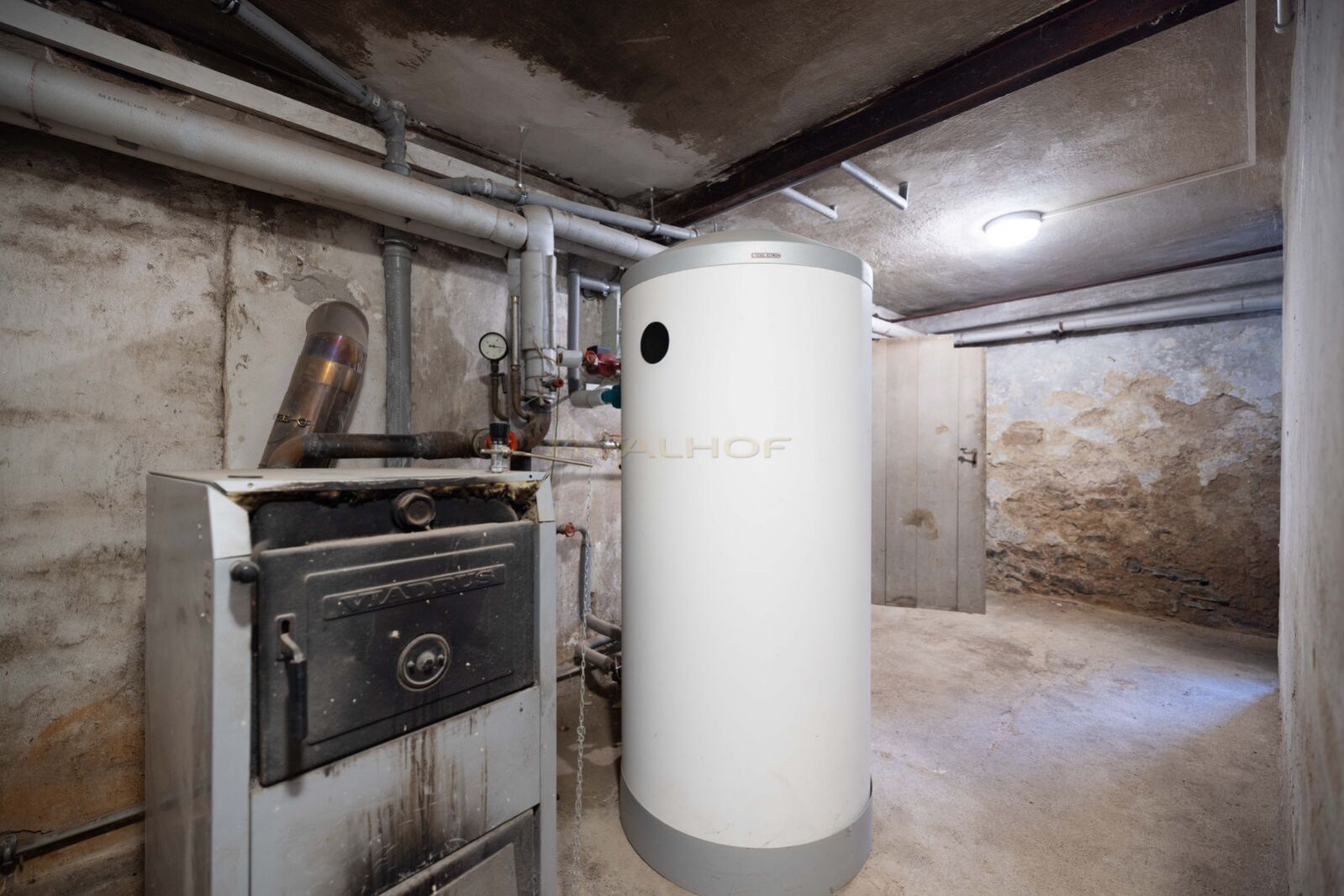 Vytápění je řešeno tepelným čerpadlem STIEBEL, v suterénu je také původní kotel na tuhá paliva.