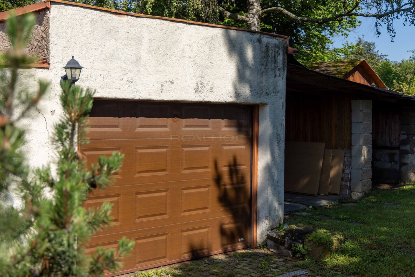 Samostatná garáž s vraty na dálkové ovládání, dřevník a zahradní domek.