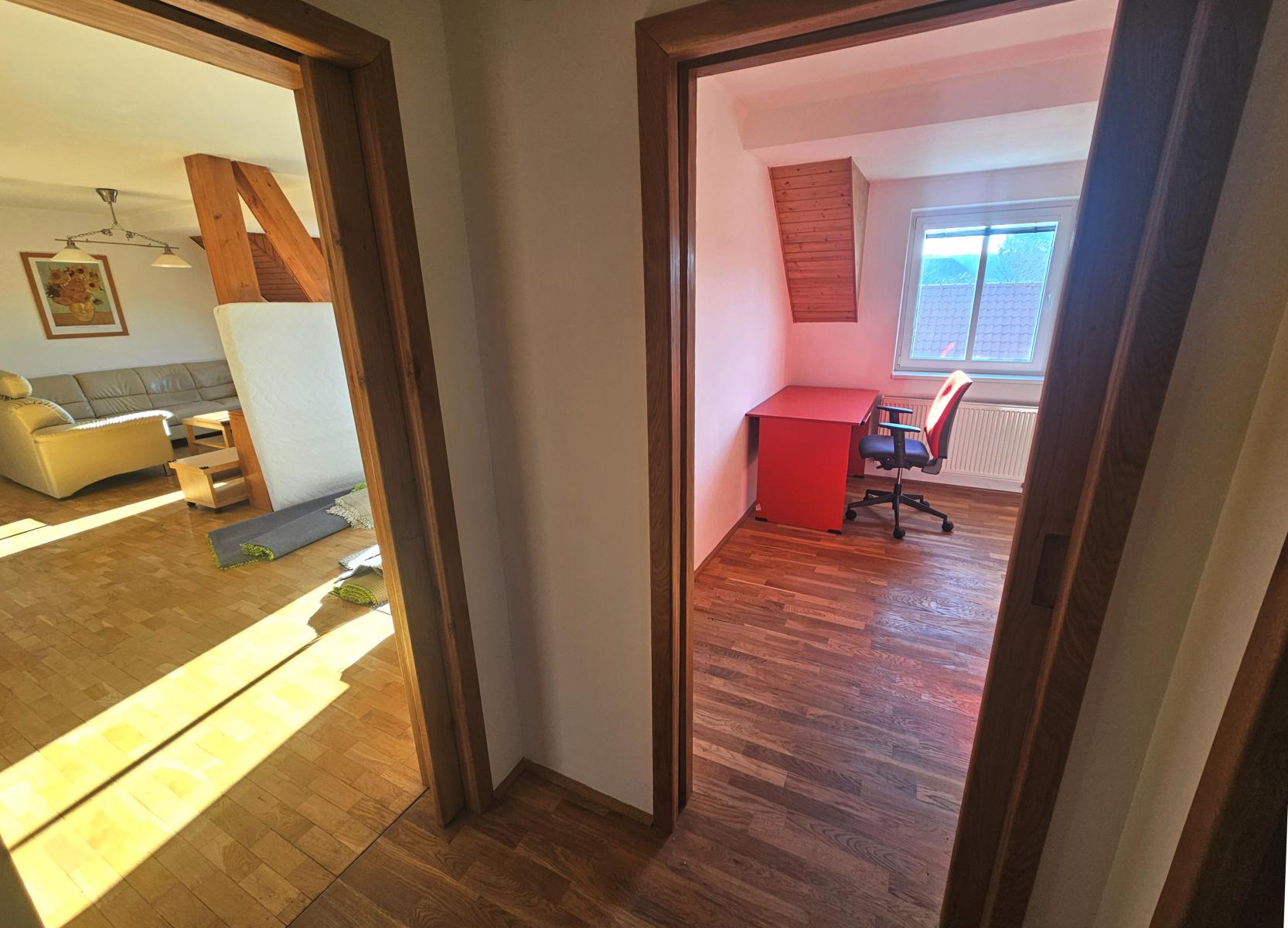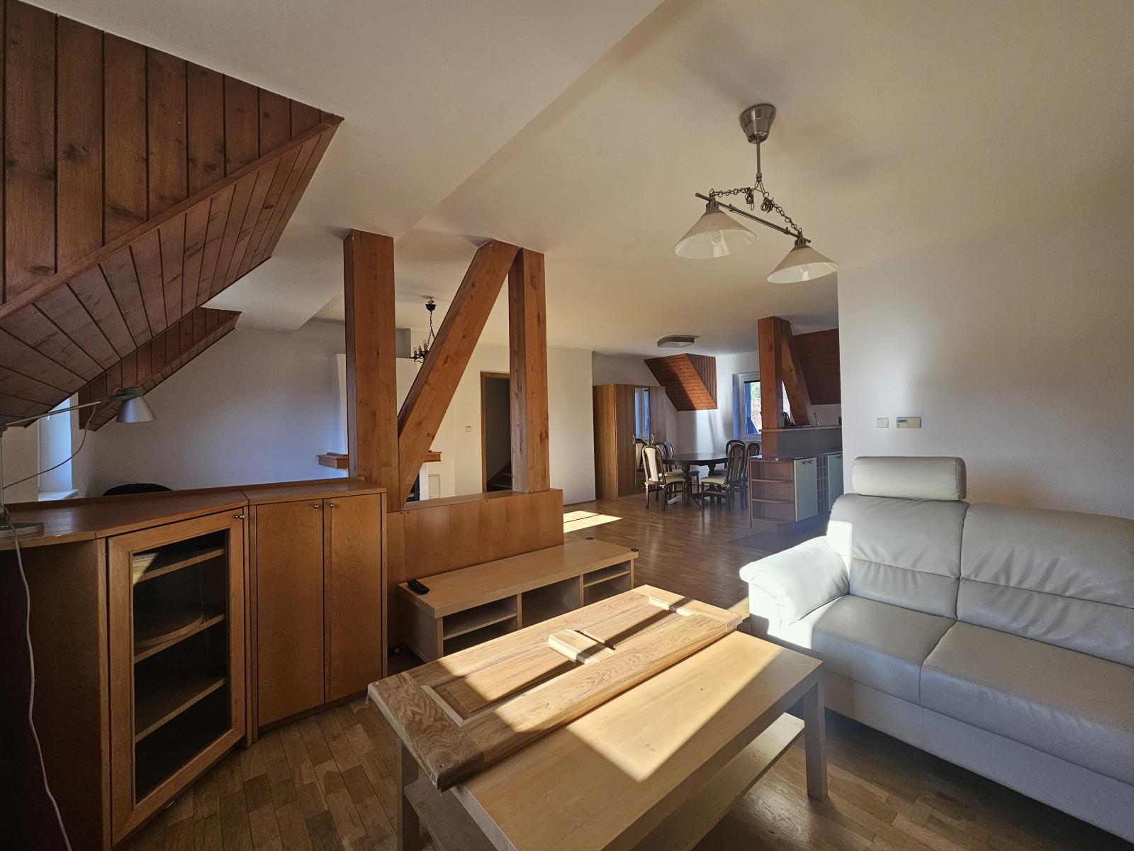 Pronájem krásného mezonetového bytu 4+kk, 160m2, který se rozkládá v podkroví a prvním patře rodinného domu. V bytě se nachází 3 oddělené pokoje (podkrovní ložnice, dětský pokoj a ložnice).