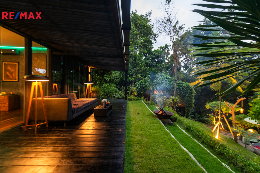 Zahrada jako z pohádky – plná palem, kapradin, stromů i tichých zákoutí, kde můžete meditovat, odpočívat nebo jen pozorovat ptáky. K tomu terasa s venkovním sezením, letní kuchyně, večerní světla podtrhující romantickou atmosféru a naprosté ticho – jen šumění větru a přírody.