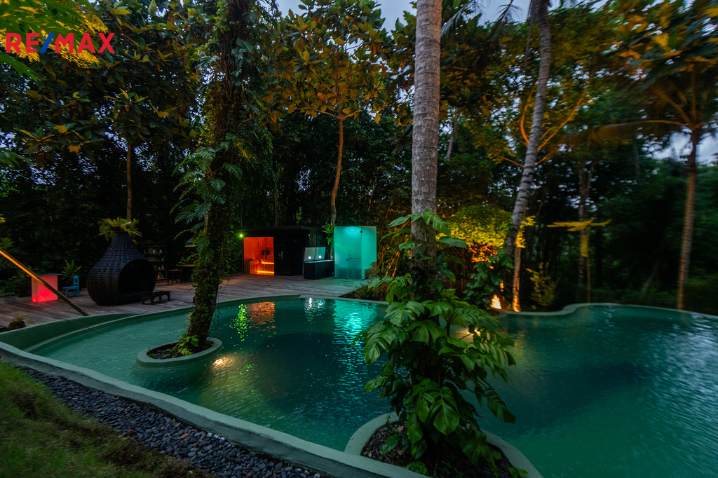 Na pozemku se nachází bazén, který připomíná tropickou lagunu. Zakřivené linie, stromy prorůstající přímo z vody, noční osvětlení, relax zóna se saunou a párou a přírodní pramen… místo, kde zcela zapomenete na realitu.