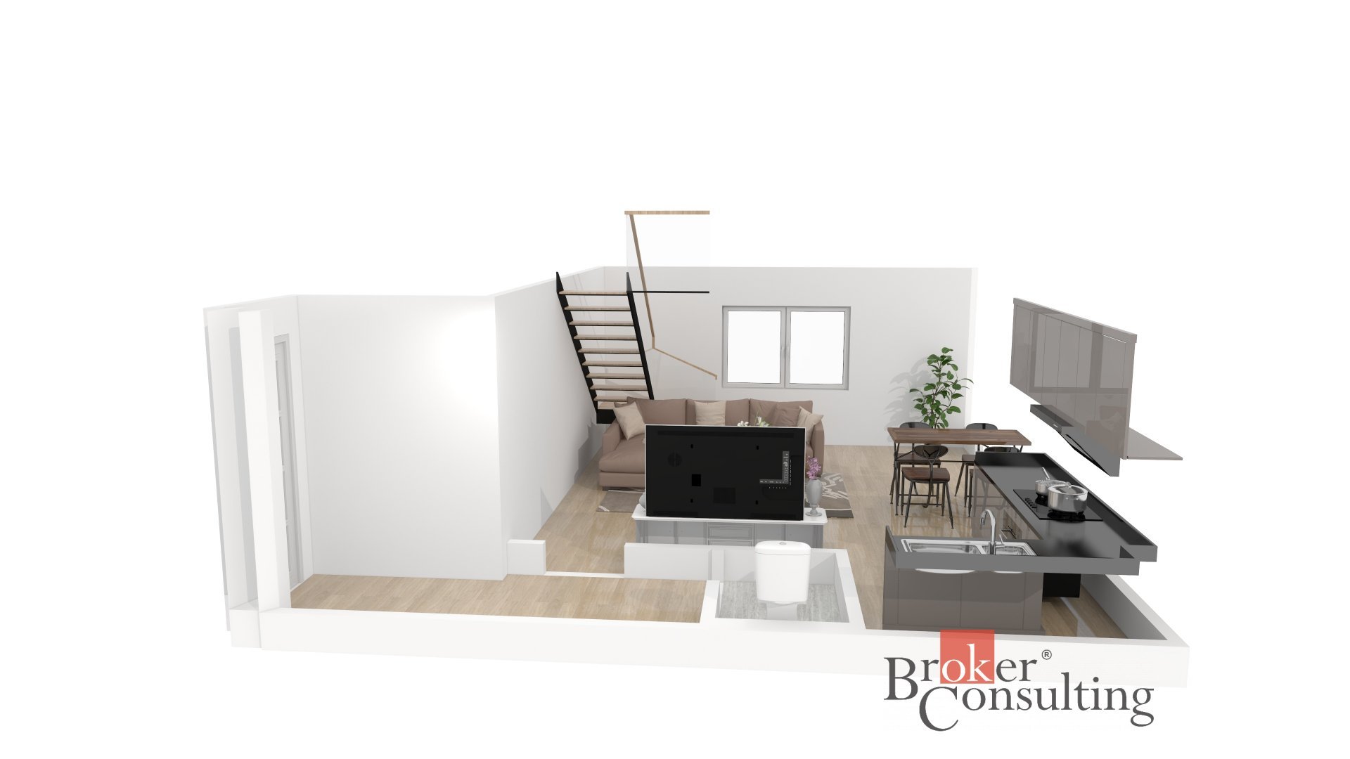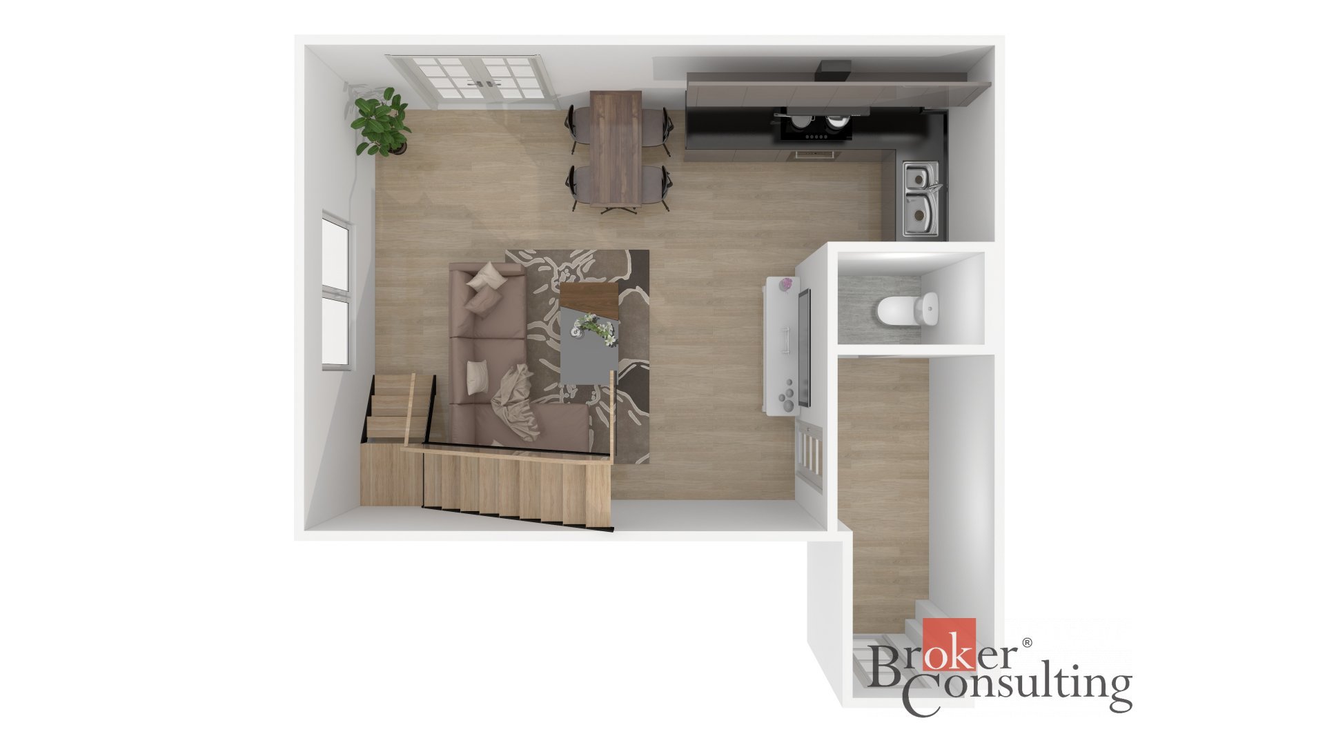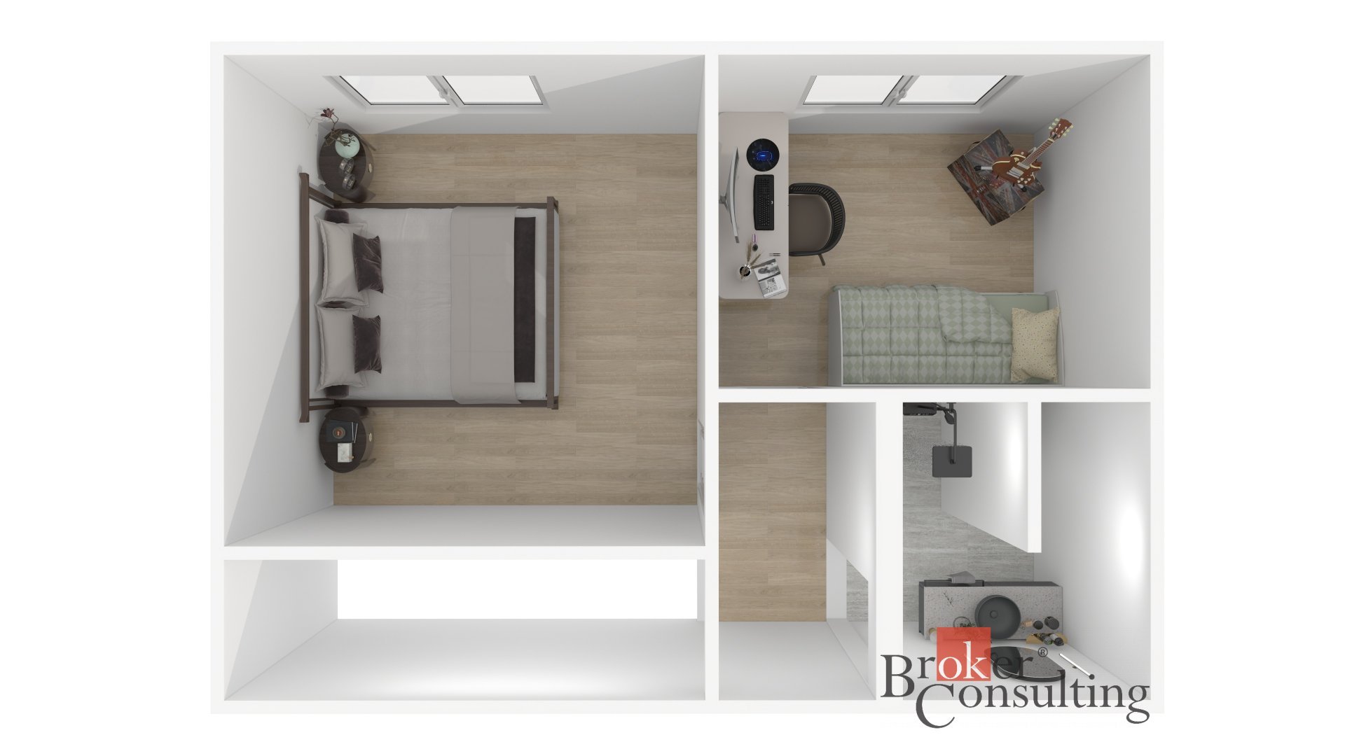 Dvoupodlažní uspořádání – v přízemí prostorný obývací pokoj s kuchyňským koutem, koupelnou a technickou místností, v patře útulná ložnice a druhý pokoj a velkorysá koupelna.