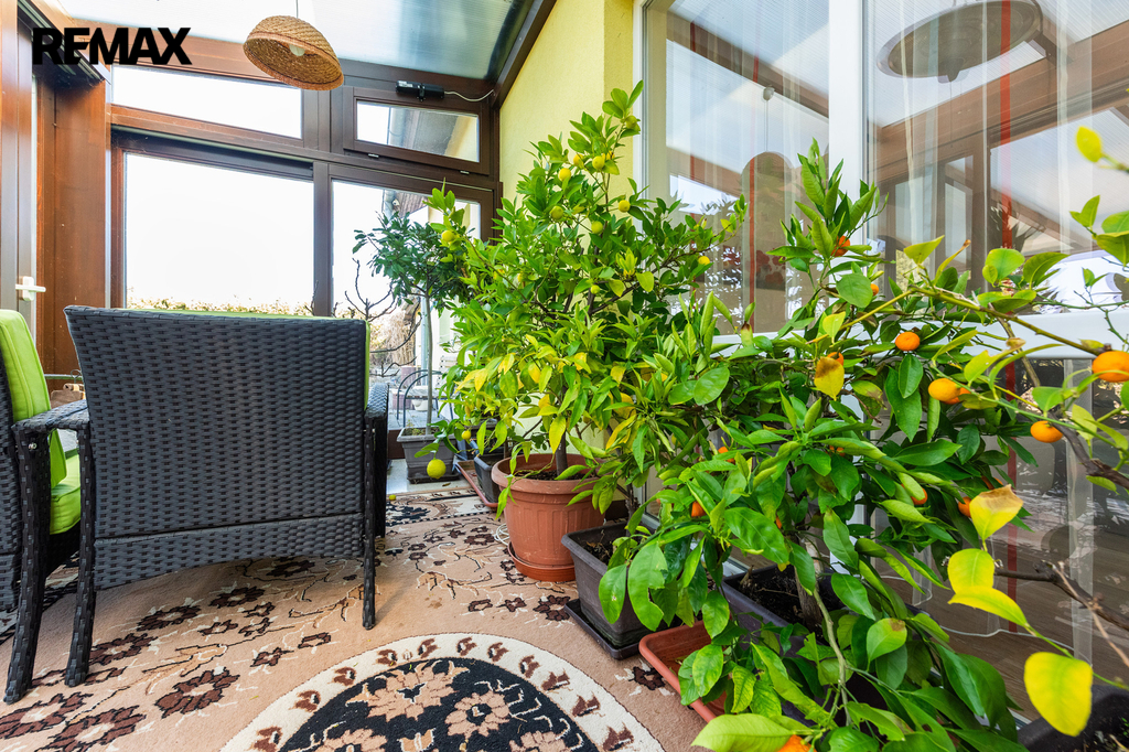 Součástí domu je zimní zahrada s optimálním klima pro pěstování např. citrusů.