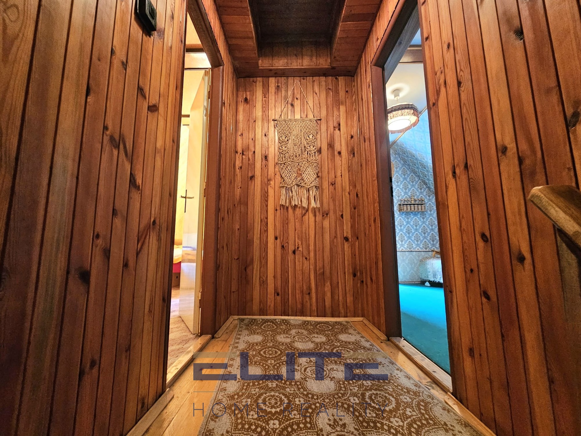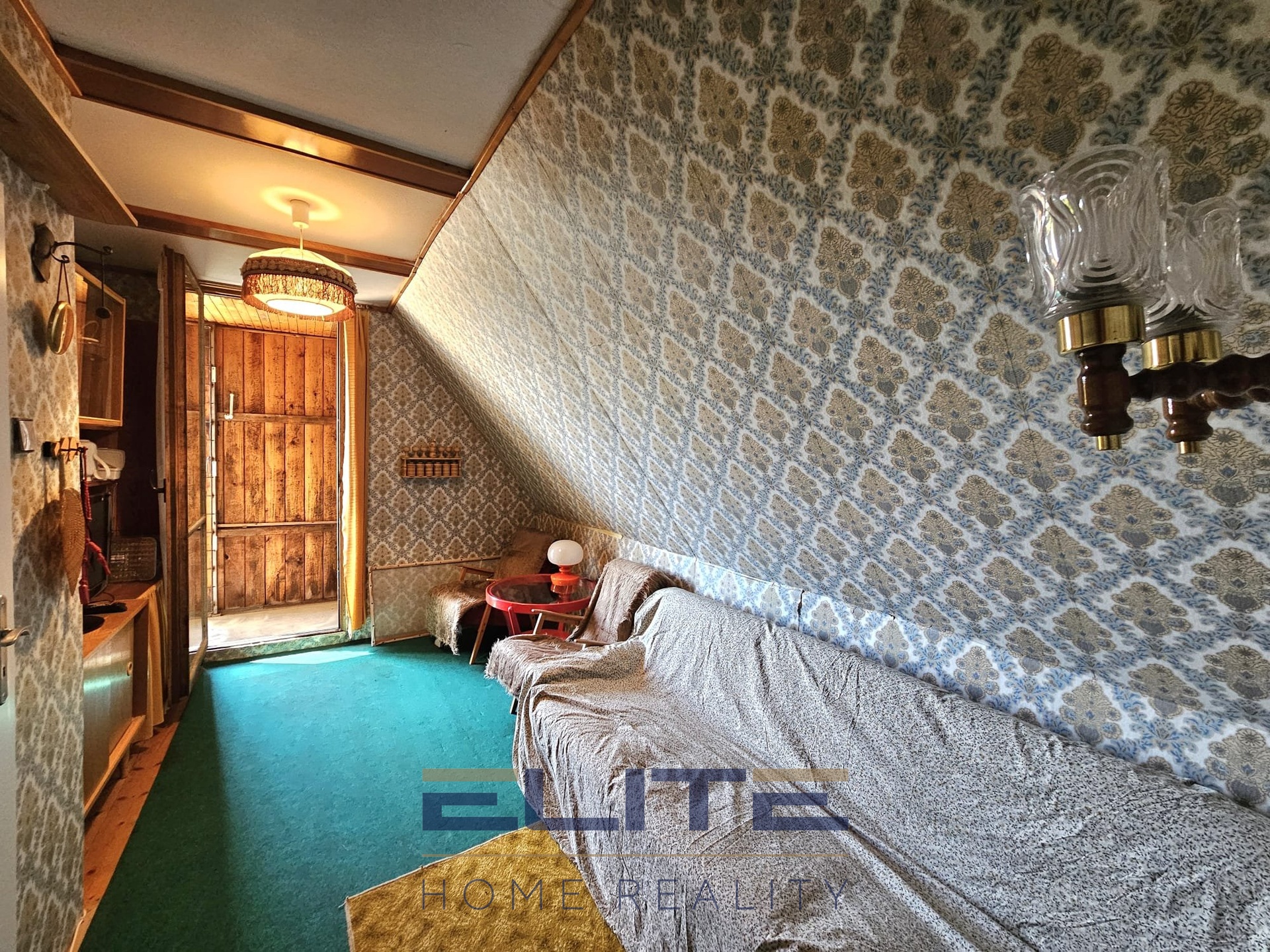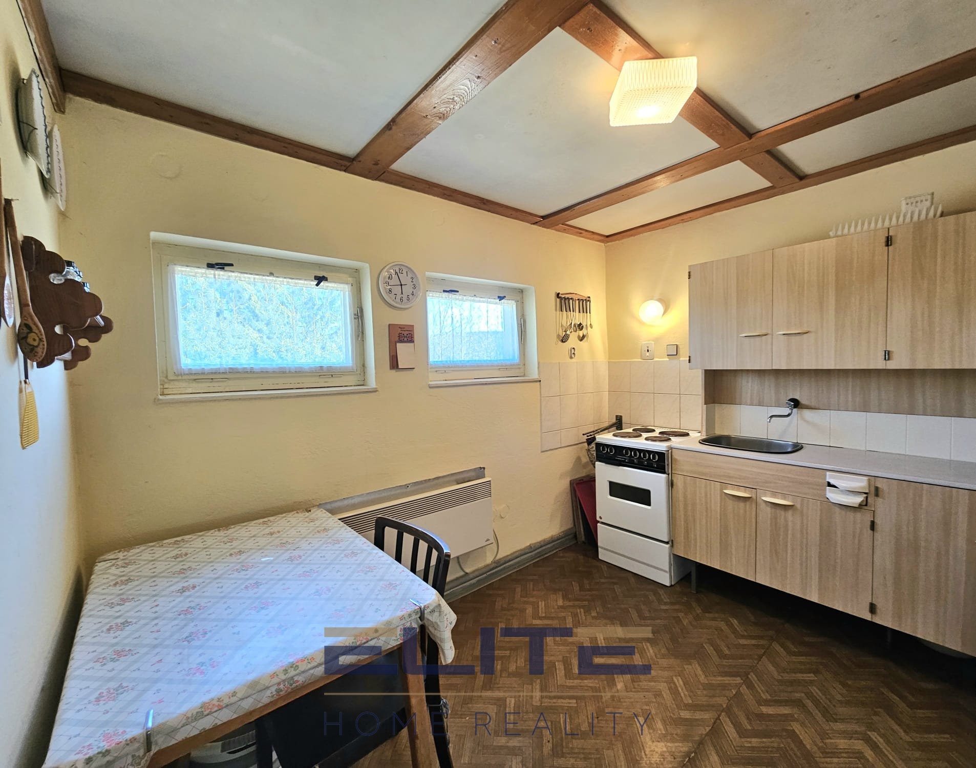 V přízemí najdete předsíň, kuchyň, koupelnu se sprchovým koutem, samostatné WC, menší pokoj a útulný obývací pokoj s krbovými kamny – přesně ten typ prostoru, kde chcete večer sedět, když venku padá sníh. Odtud vedou dřevěné schody do patra, kde jsou čtyři pokojíky pro rodinu nebo hosty.