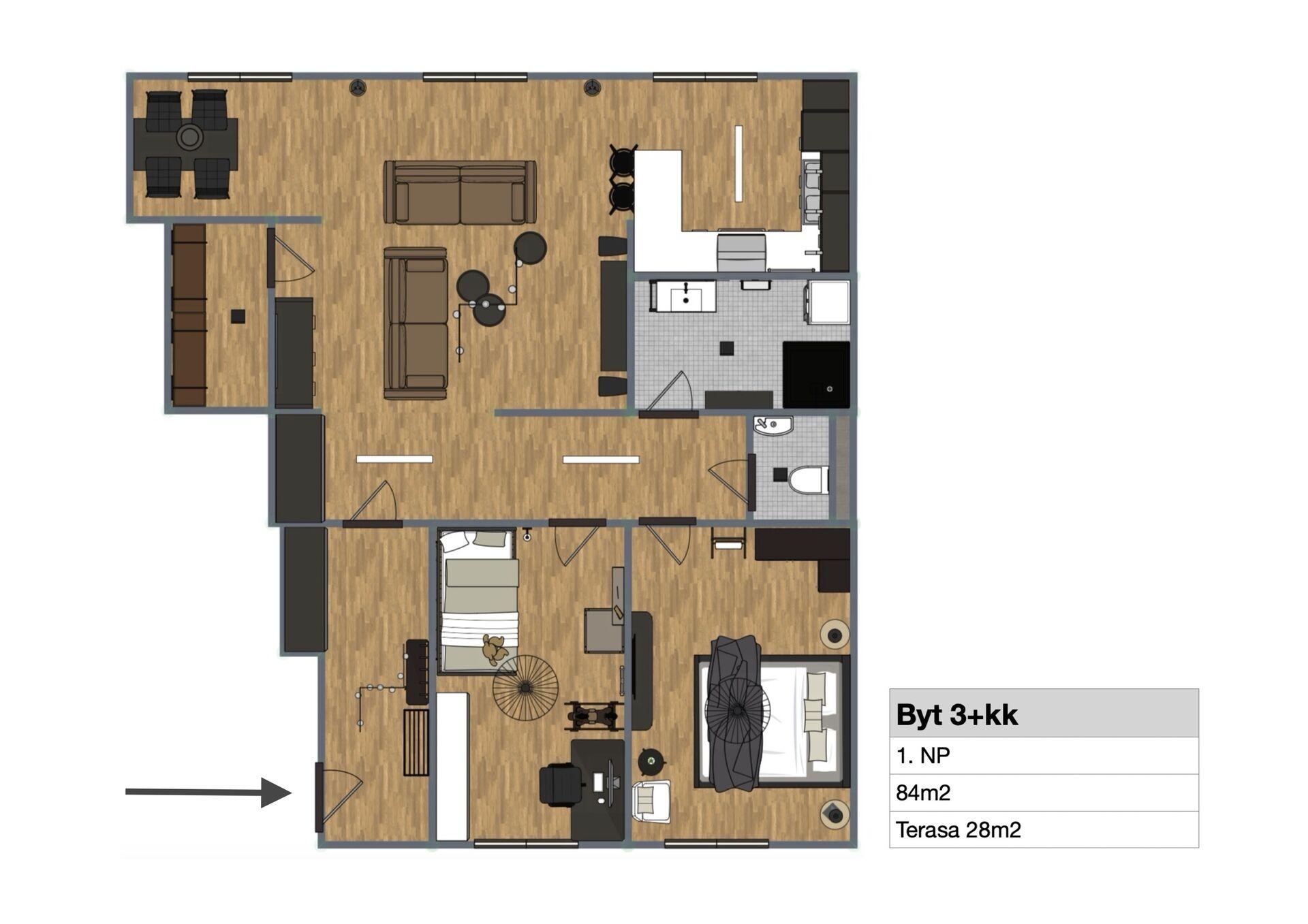 - Dispozice bytu: 3+kk