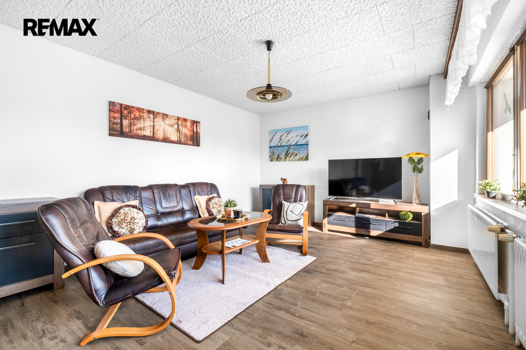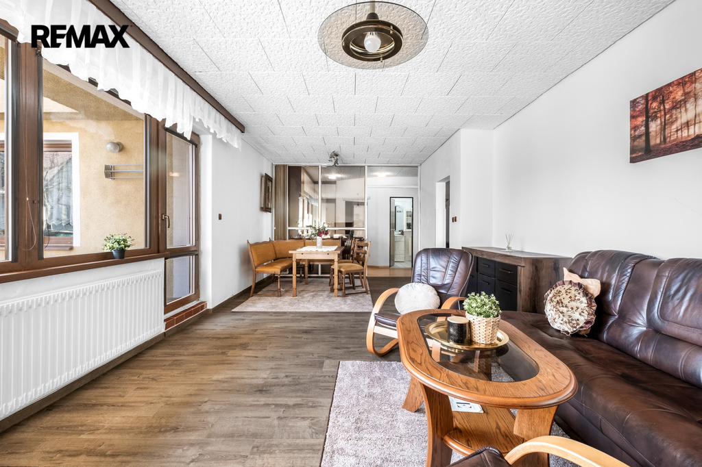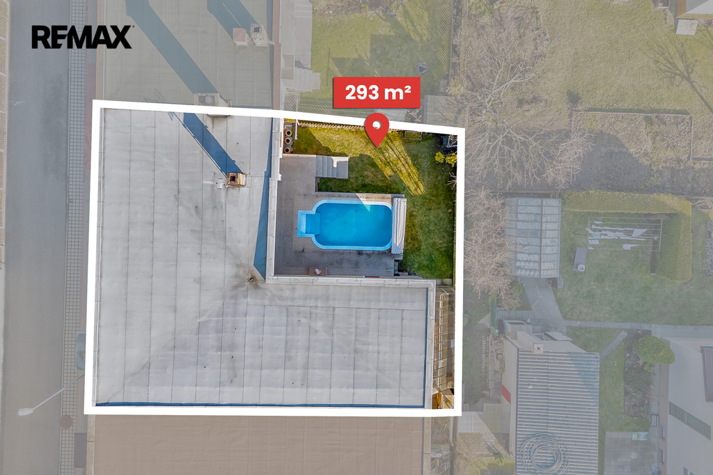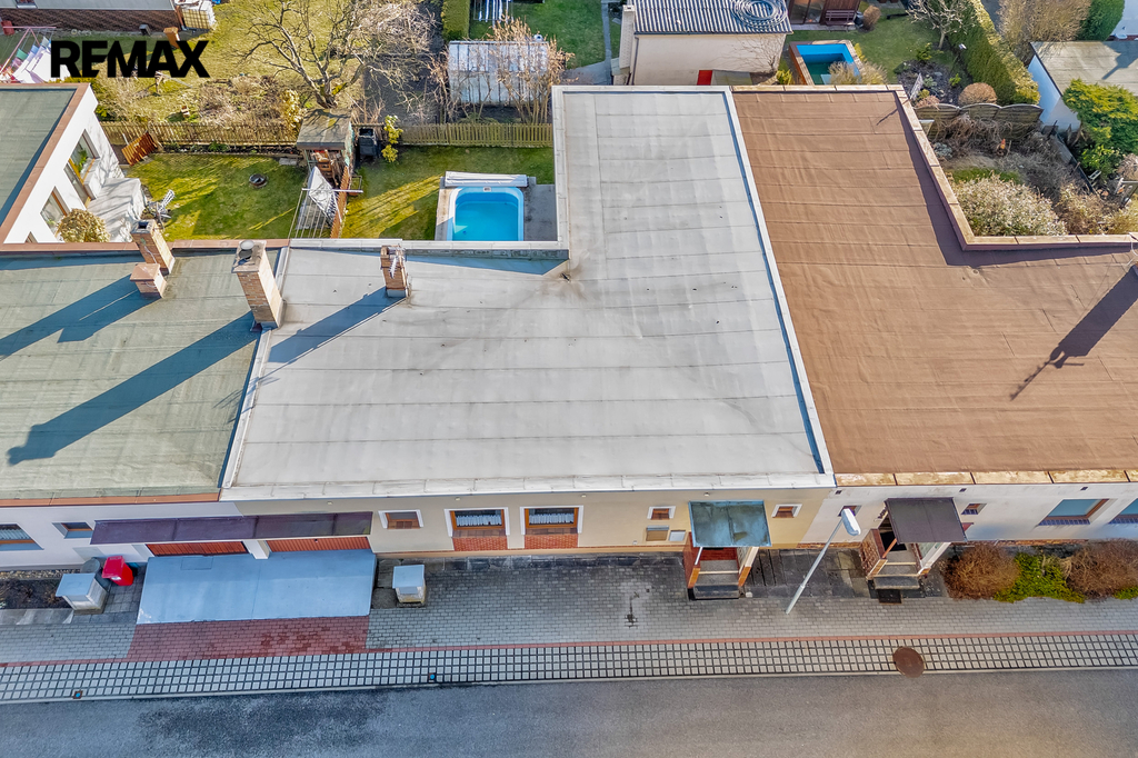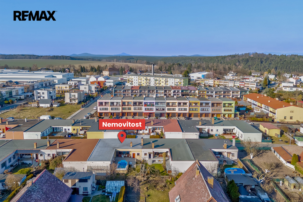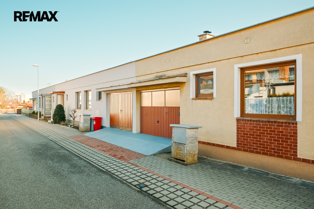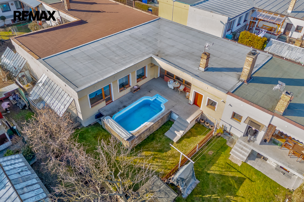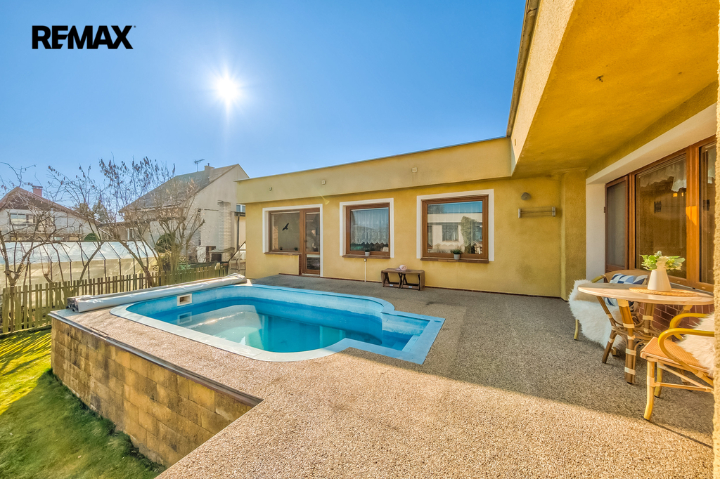 Rodinný dům 4+1, řadový, přízemní, částečně podsklepený, s garáží, zahradou, terasou a bazénem.