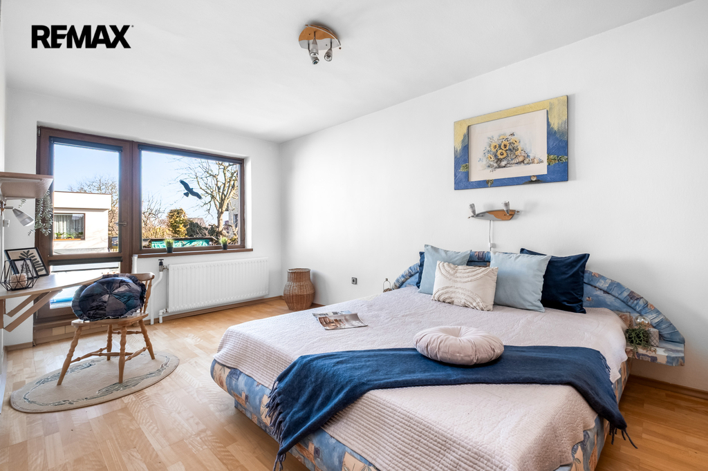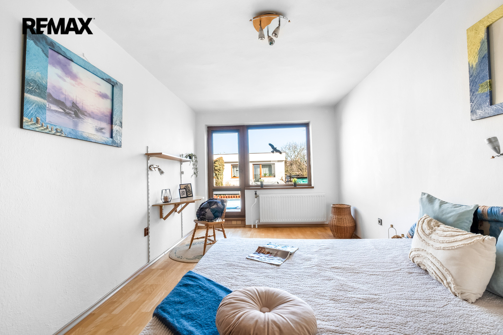 Z hlavní ložnice i z obývacího pokoje je přímý vstup na terasu a zahradu.