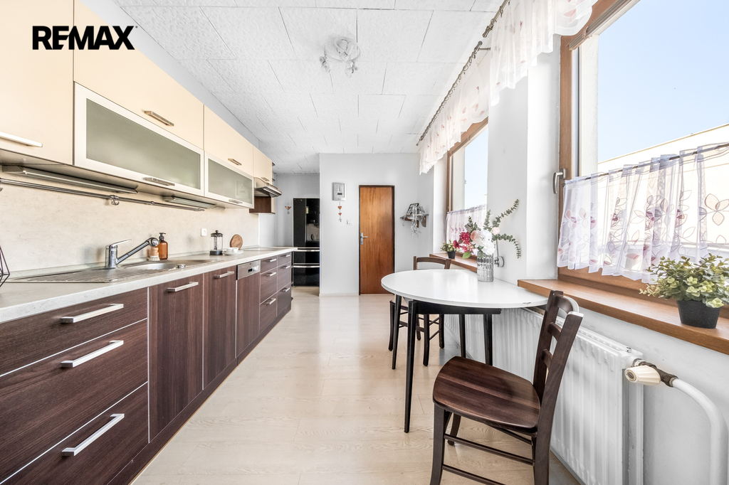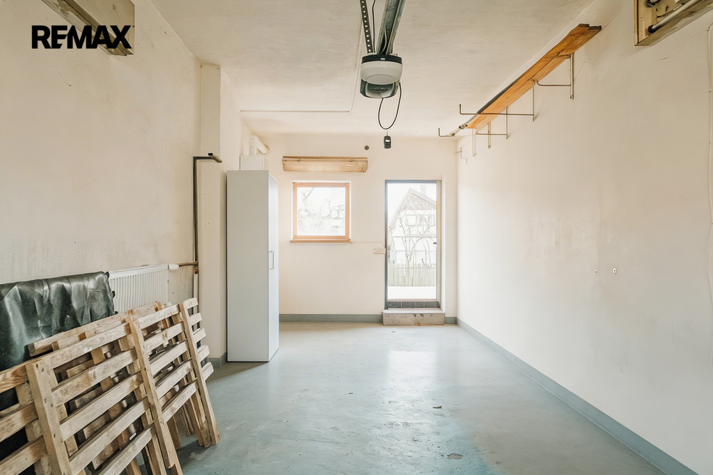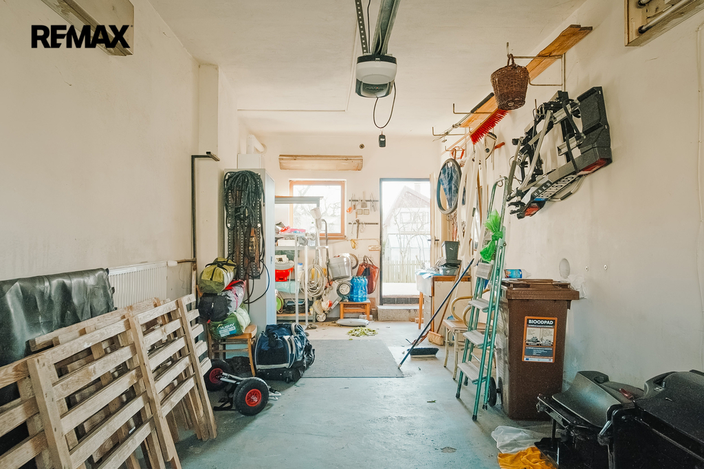 Součástí domu je garáž, která je průchozí z ulice až na zahradu. Z garáže se navíc dostanete přímo do sklepa nebo do kuchyně. Po zaparkování tak můžete nákup pohodlně vynést rovnou do domu.
