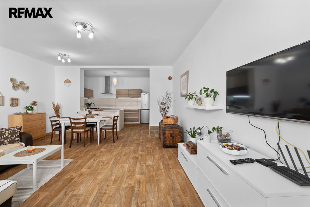 Byt 2+1 sestává ze vstupní chodby, kuchyně s možností přímého vstupu na terasu, velkého obývacího pokoje, dalšího pokoje a koupelny (sprchový kout) s WC.
