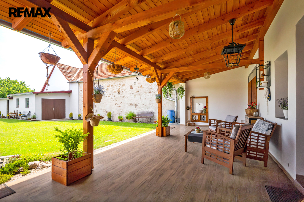 Prostorná krytá terasa nabízí dostatek prostoru pro klidné posezení a relaxaci s dostatkem soukromí a výhledem nejen do zahrady.