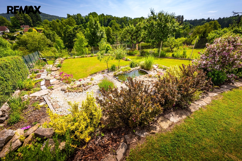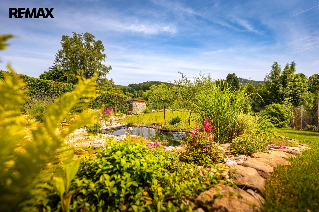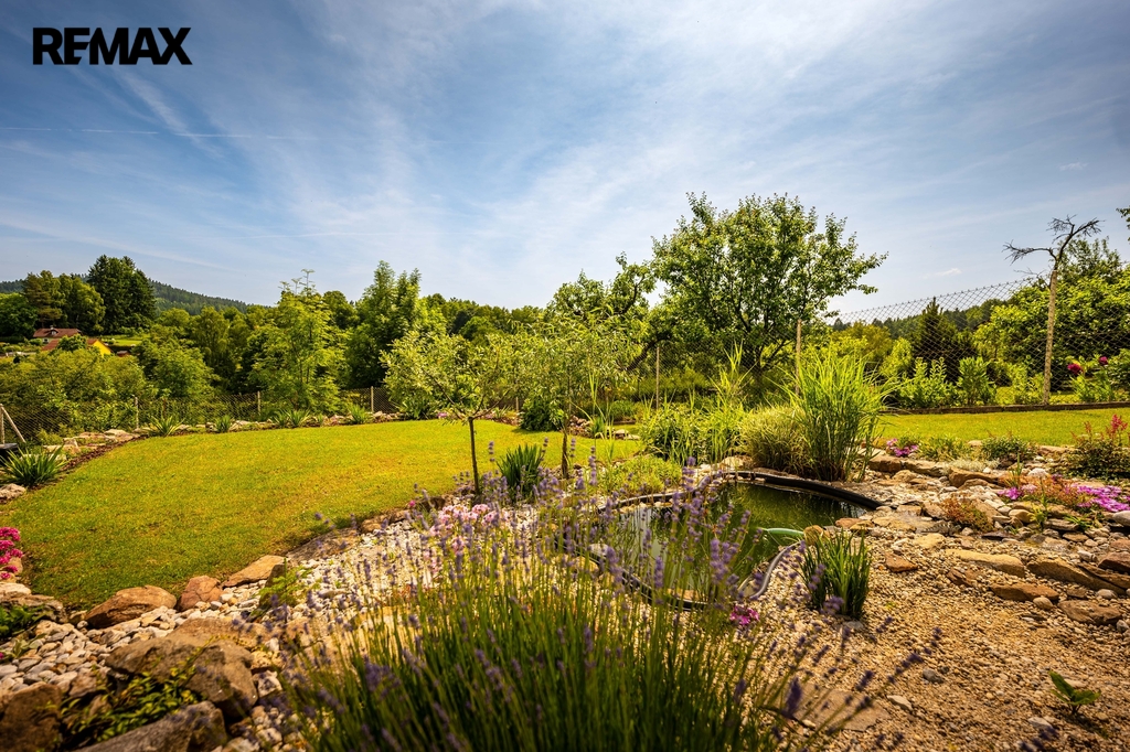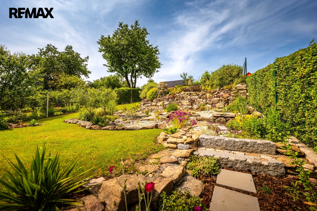 Zahrada byla při rekonstrukci domu také nově zbudována, v horní části je využívána jako částečně užitková pro pěstování, spodní část zahrady s jezírkem slouží jako okrasná.