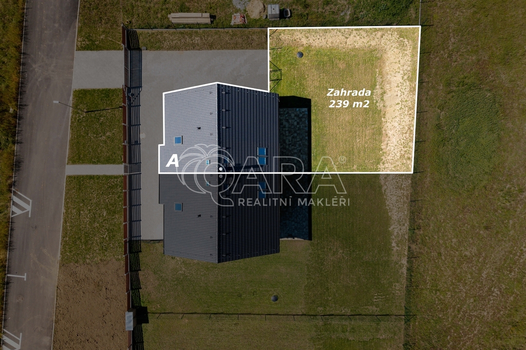 Dům je francouzským oknem v obývacím pokoji přirozeně propojen se zahradou o velikosti 239 m² (jedná se o čistou plochu zahrady ve které není započítána zastavěná plocha, parkoviště a prostor před domem), jejíž součástí je na dům navazující 28 m² vydlážděná terasa, díky jejíž severní orientaci si můžete venkovní prostor užít i v horké a slunné dny. Zahrada je kompletně oplocená, zatravněná a čeká na případné finální úpravy od nových majitelů. Akumulační nádrž (3 m3) pro budoucí hospodaření s dešťovou vodou je již na pozemku umístěna.