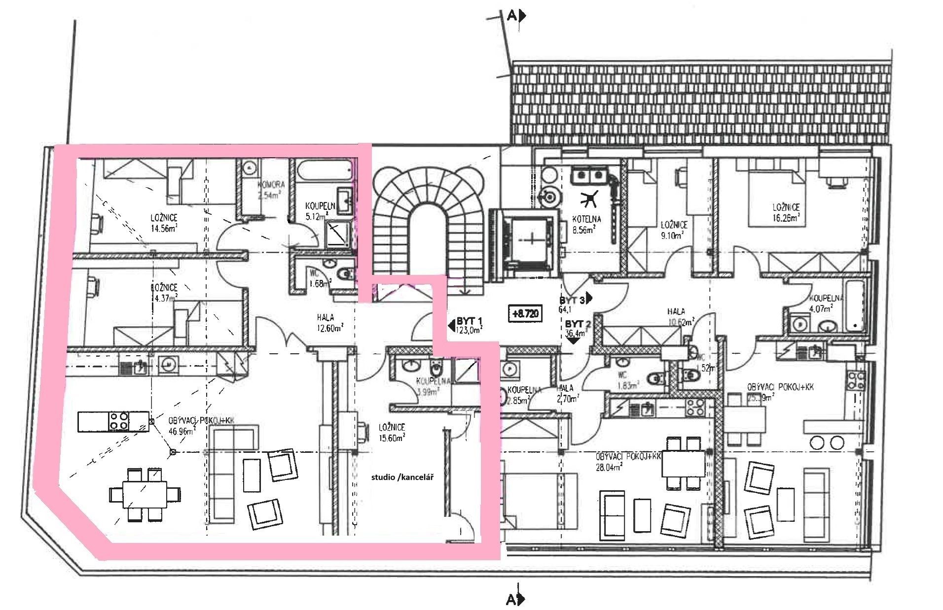 Hlavní část bytu má dispozici 3+kk o velikosti cca 100 m²:
