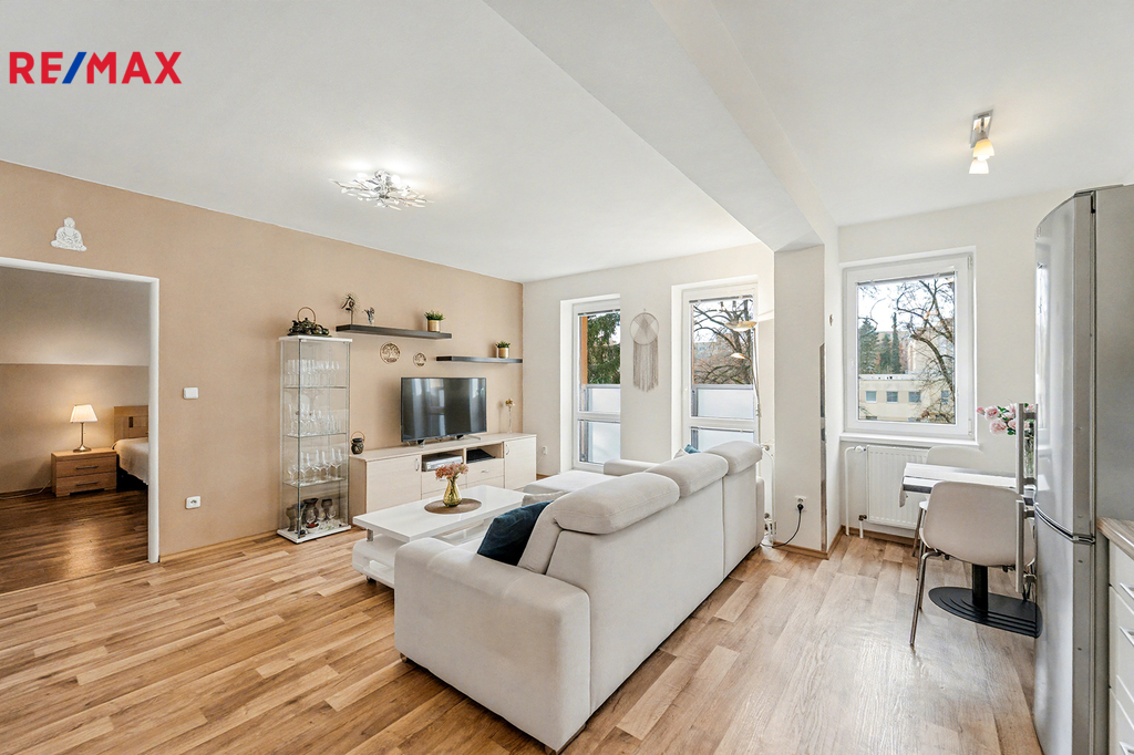 Dispozice bytu je velmi praktická a nabízí komfortní zázemí pro každodenní život. Součástí je kuchyňský kout, prostorný obývací pokoj, ložnice, další pokoj vhodný jako dětský pokoj či pracovna, koupelna se sprchovým koutem, samostatná toaleta a předsíň s úložným prostorem. K bytu náleží také sklepní kóje v suterénu domu.