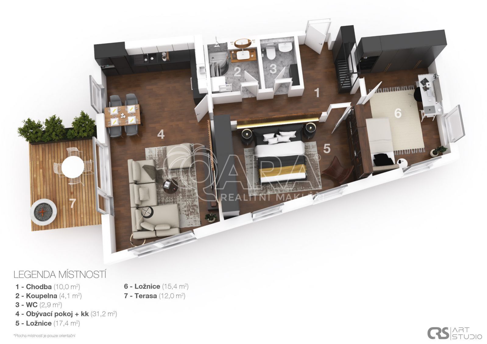 Byt, kolaudovaný v roce 2014, má dispozici 3+kk a je opravdu prostorný předsíň má 10 m2, ložnice 17,4 a 15,4 m2, obývák s budoucím kuchyňským koutem 31,2 m2, koupelna 4,1 m2 a WC s pračkou 2,9 m2. Dále k bytu patří velký sklep 5,5 m2 a výjimečně i předzahrádka 90 m2, jejíž součástí je terasa o ploše cca 12 m2. Obývací pokoj a předzahrádka jsou orientované na jihozápad, pokoje na severovýchod a jihovýchod. Parkovat zdarma můžete na veřejném parkovišti cca 50 metrů od bytu.