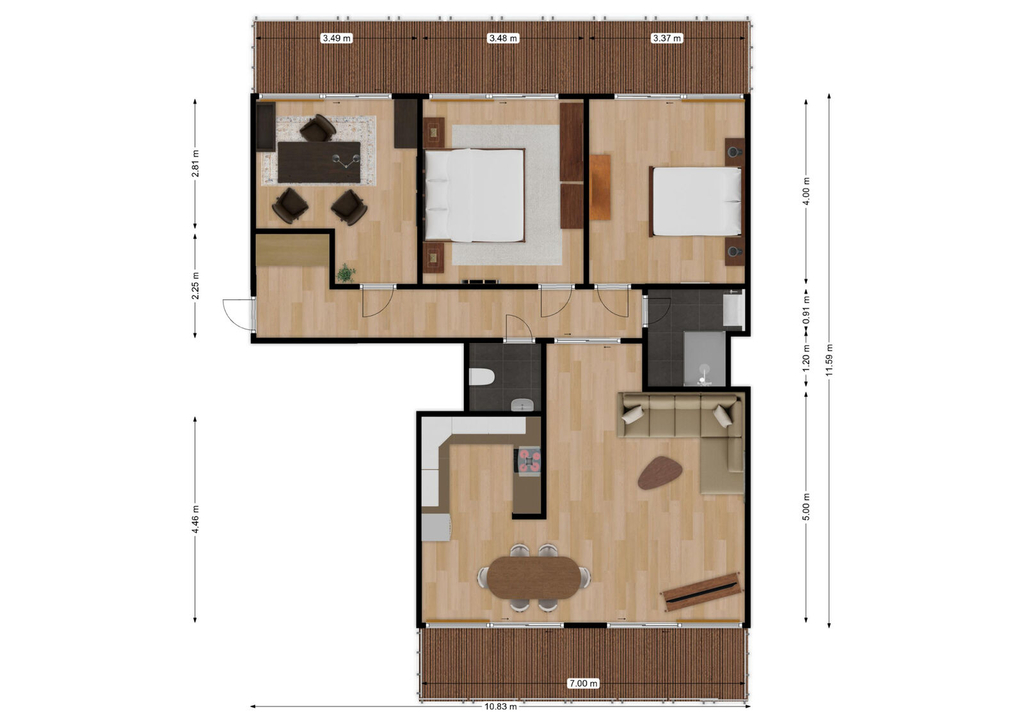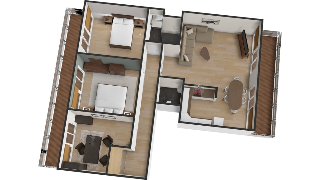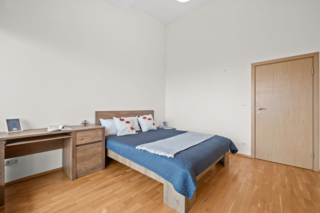 Tento prostorný byt situovaný ve 3. patře moderního domu, nabízí velkorysých 93,5m2. Je ideálně navržen pro rodinný život s důrazem na soukromí. Srdcem domova je otevřený a světlý obývací pokoj s kuchyňským koutem, který je perfektní pro společné chvíle a reprezentaci. Díky odděleným pokojům pro děti a rodiče, naleznete klid a komfort pro všechny. Velkou přidanou hodnotou jsou dva samostatné balkony, přístupné z hlavních místností. Ty Vám umožní vypít ranní kávu nebo relaxovat s pohledem na okolní přírodu. Samozřejmostí je k bytu také garážové místo a sklep pro ukládání věcí. Tento byt je připraven stát se Vaším novým domovem, který splňuje ty nejvyšší nároky na kvalitu a provedení.