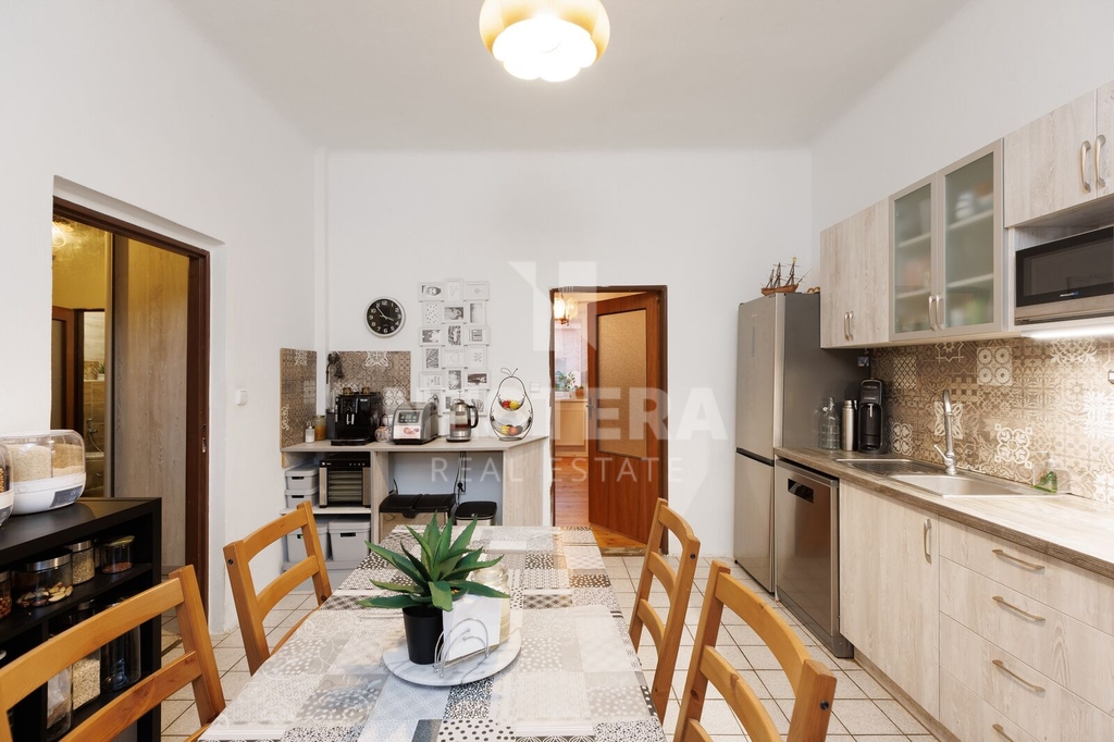 • BJ 4+1 s výměrou 108,29 m². Byt je rozdělen na předsíň, prostornou chodbu s vestavěnou skříní, samostatné toalety/technickou místnost (pračka, kotel), koupelnu s vanou, plně vybavenou kuchyni s výhledem do zahrady, pokoj pro hosty, obývací pokoj s krbovými kamny, dětský pokoj a ložnici.