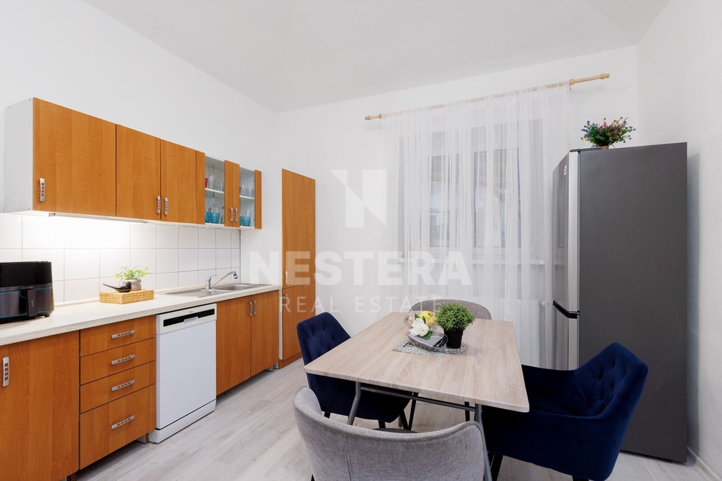 • BJ 3+1 s výměrou 56,96 m². Byt je po rekonstrukci a je rozdělen na chodbu, ložnici s okny do ulice, malý pokojíček, obývací pokoj s okny do ulice, koupelnu se sprchovým koutem s vaničkou a toaletou a kuchyni s okny do dvora.