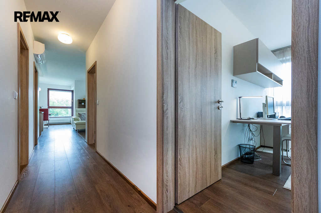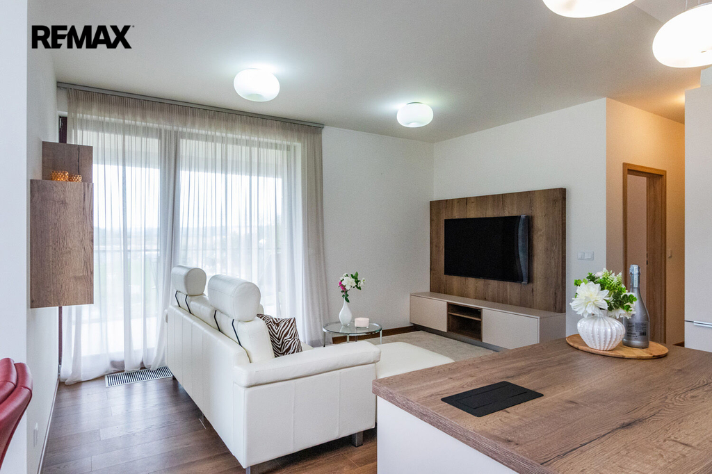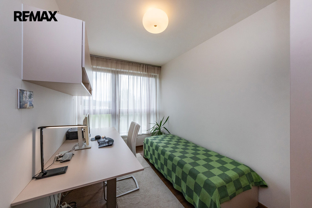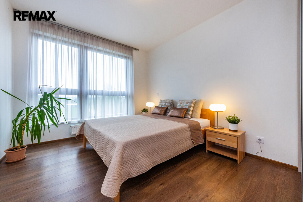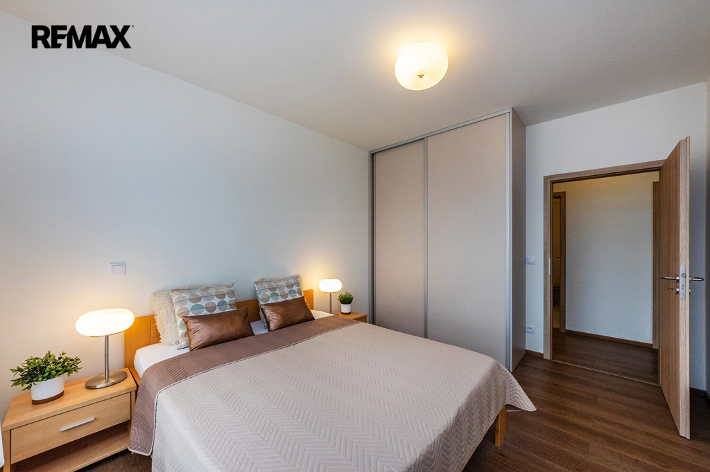 Prakticky navržený byt je vhodný jak pro komfortní rodinné bydlení, tak i pro jednotlivce. Plně vybavený kuchyňský kout s jídelnou zaujme svým estetickým provedením a je příjemně prosvětlen velkým oknem s výhledem do okolní zeleně. Z útulného obývacího pokoje je přímý vstup na velkorysou terasu. Ložnice i dětský pokoj či pracovna jsou rovněž prosvětleny denním světlem díky velkým oknům, která jsou, stejně jako ostatní okna v bytě, vybavena venkovními roletami zajišťujícími maximální komfort a soukromí. Pro příjemné klima v průběhu celého roku je byt dále vybaven klimatizací.
