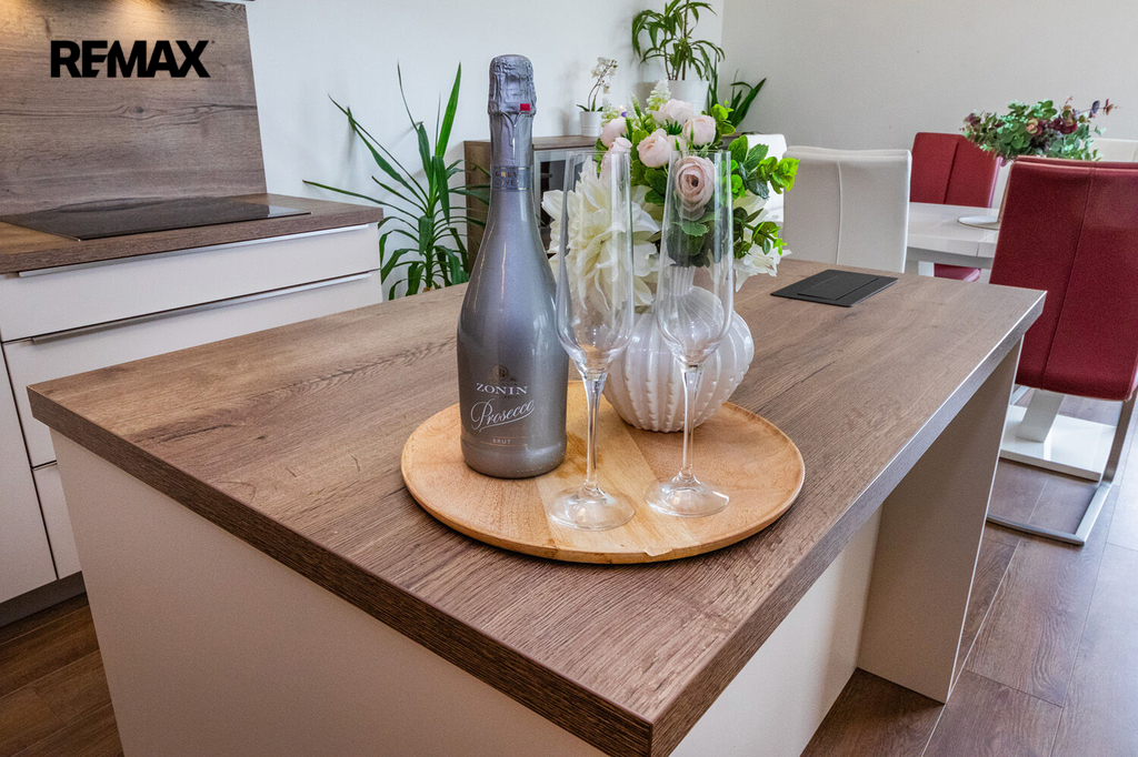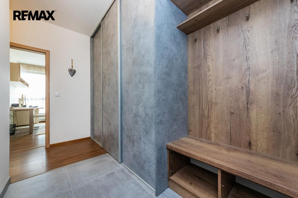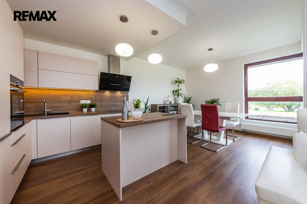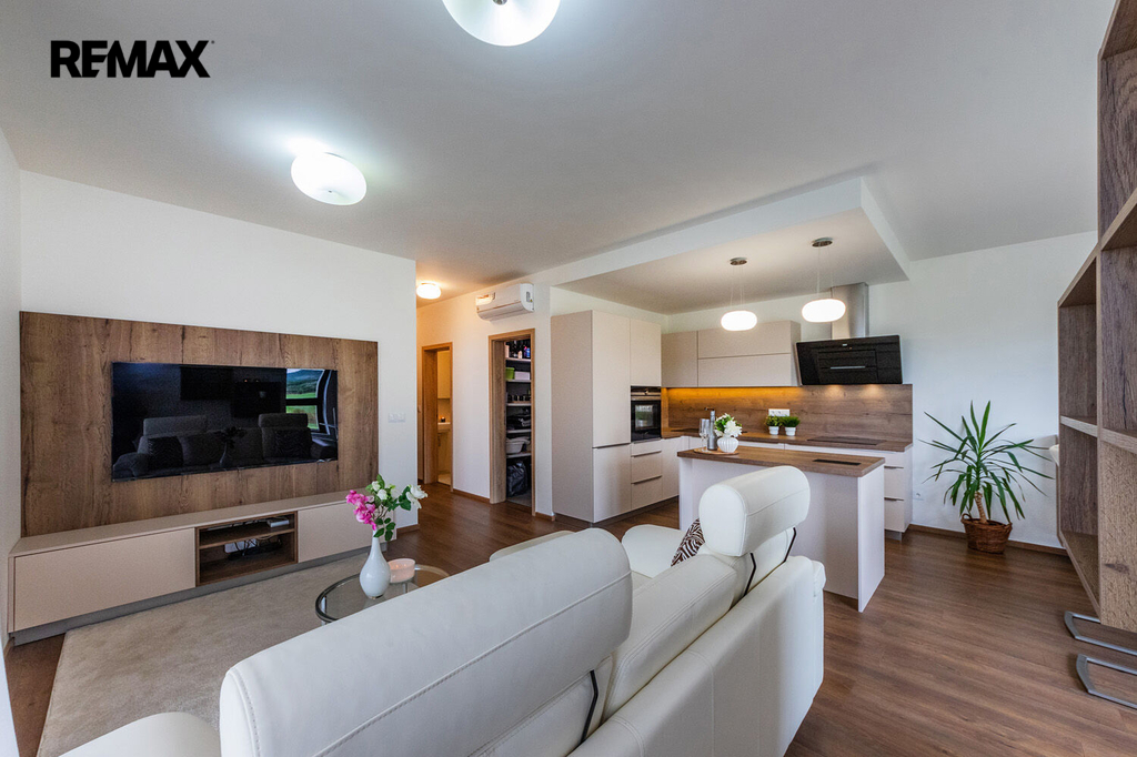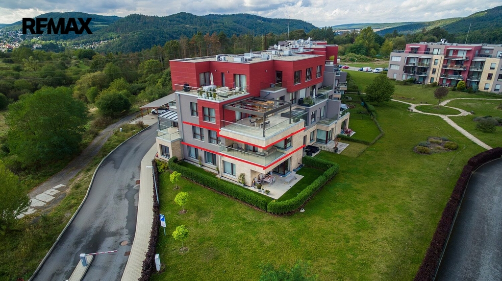 Prakticky navržený byt je vhodný jak pro komfortní rodinné bydlení, tak i pro jednotlivce. Plně vybavený kuchyňský kout s jídelnou zaujme svým estetickým provedením a je příjemně prosvětlen velkým oknem s výhledem do okolní zeleně. Z útulného obývacího pokoje je přímý vstup na velkorysou terasu. Ložnice i dětský pokoj či pracovna jsou rovněž prosvětleny denním světlem díky velkým oknům, která jsou, stejně jako ostatní okna v bytě, vybavena venkovními roletami zajišťujícími maximální komfort a soukromí. Pro příjemné klima v průběhu celého roku je byt dále vybaven klimatizací.