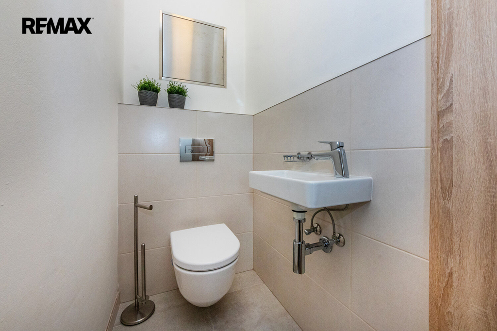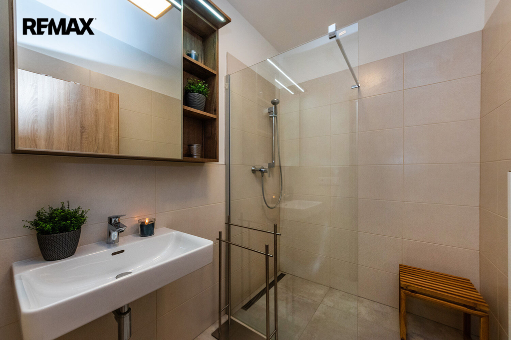Koupelna disponuje sprchovým koutem, WC je samostatné. Úložné prostory bytu jsou prakticky řešeny komorou a vestavěnou stěnou v předsíni. Byt je nabízen kompletně zařízený, poskytuje nadstandardní úložné prostory a je připraven k okamžitému nastěhování.