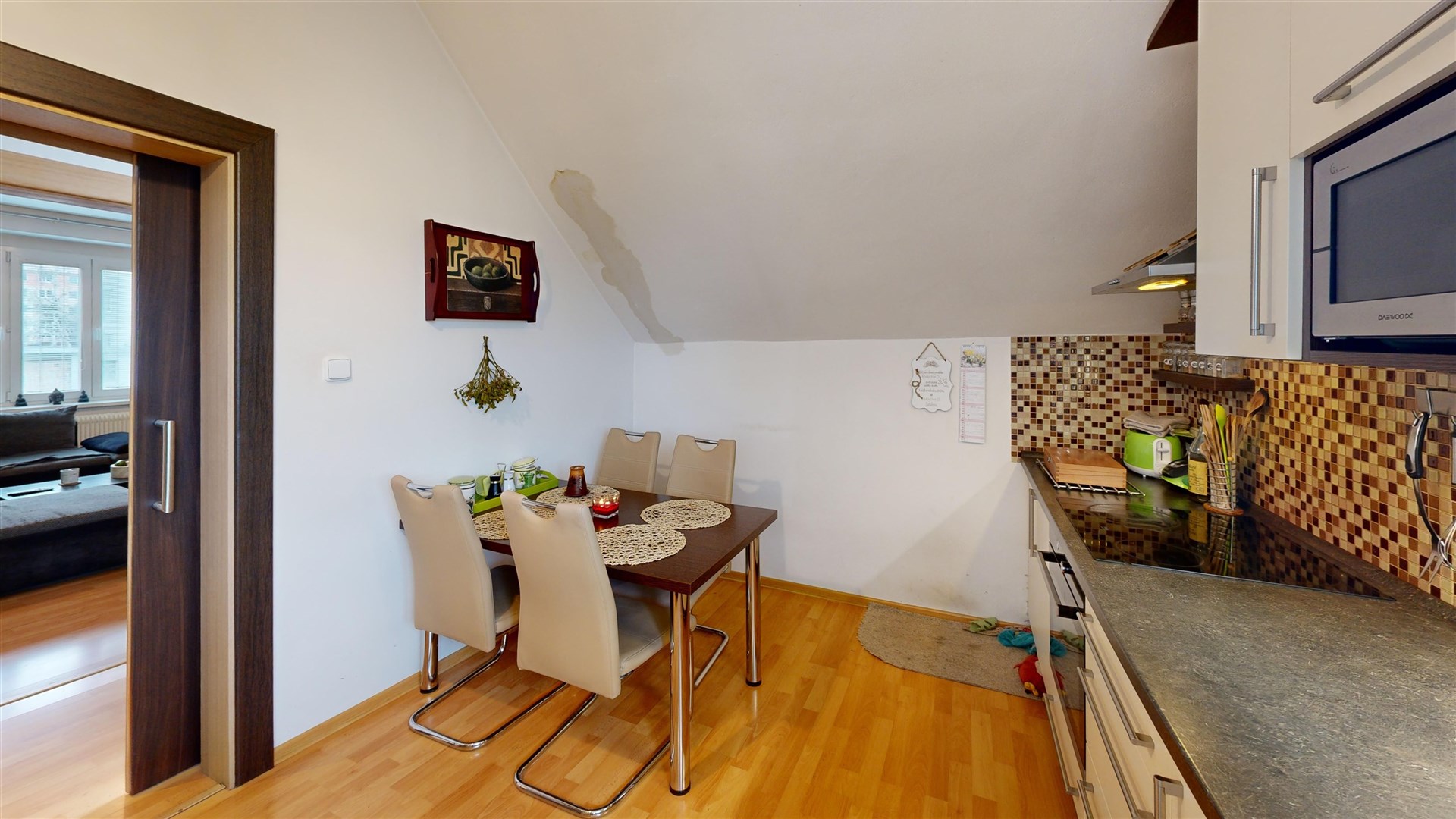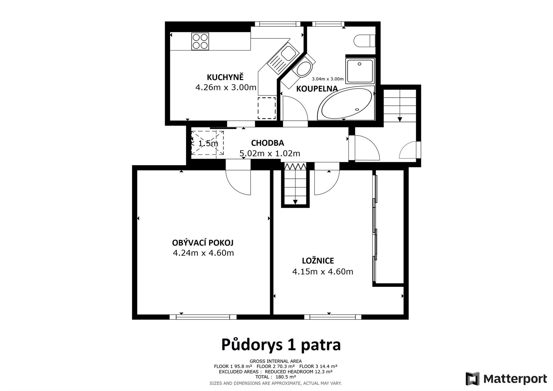 • 1. patro + podkroví (mezonet) – byt 3+1 o celkové výměře 97,5 m², rovněž se společným vstupem.