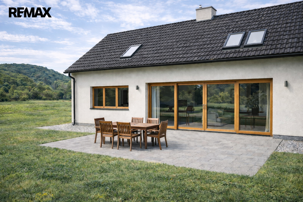 Pro lepší představivost je inzerát doplněn vizualizací moderního venkovského domu s jedním nadzemním podlažím, obytným podkrovím a garáží pro dva vozy. Navrhovaná dispozice 4+1 o celkové výměře 180 m² odpovídá regulativům územního plánu.