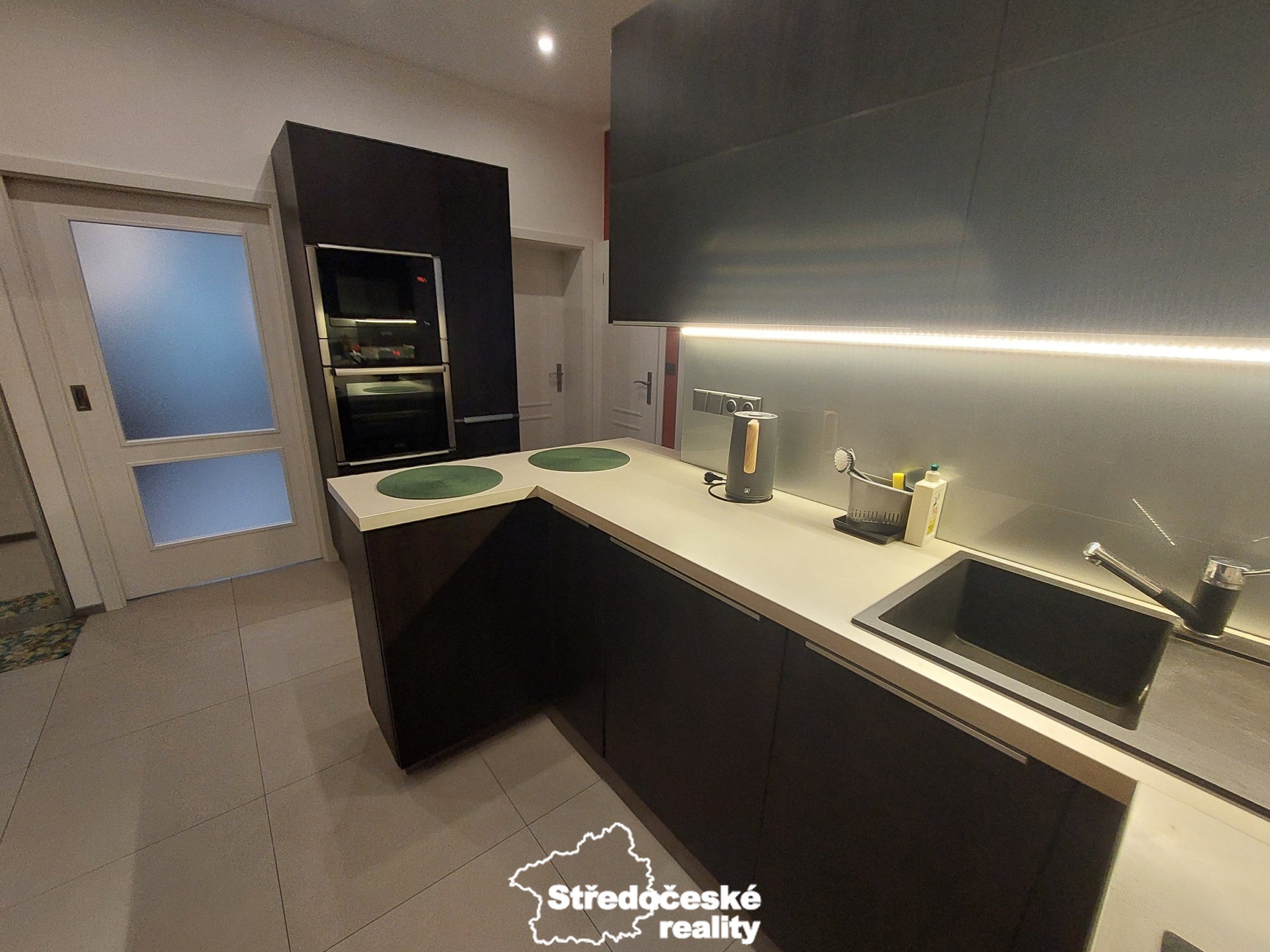 Kuchyňská linka od renomované firmy Kuchyně Petříček je vybavena vestavěnými spotřebiči Gorenje- vestavěná elektrická horkovzdušná trouba, mikrovlnná trouba, myčka, indukční varná deska a digestoř.