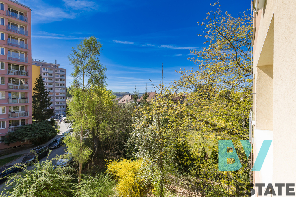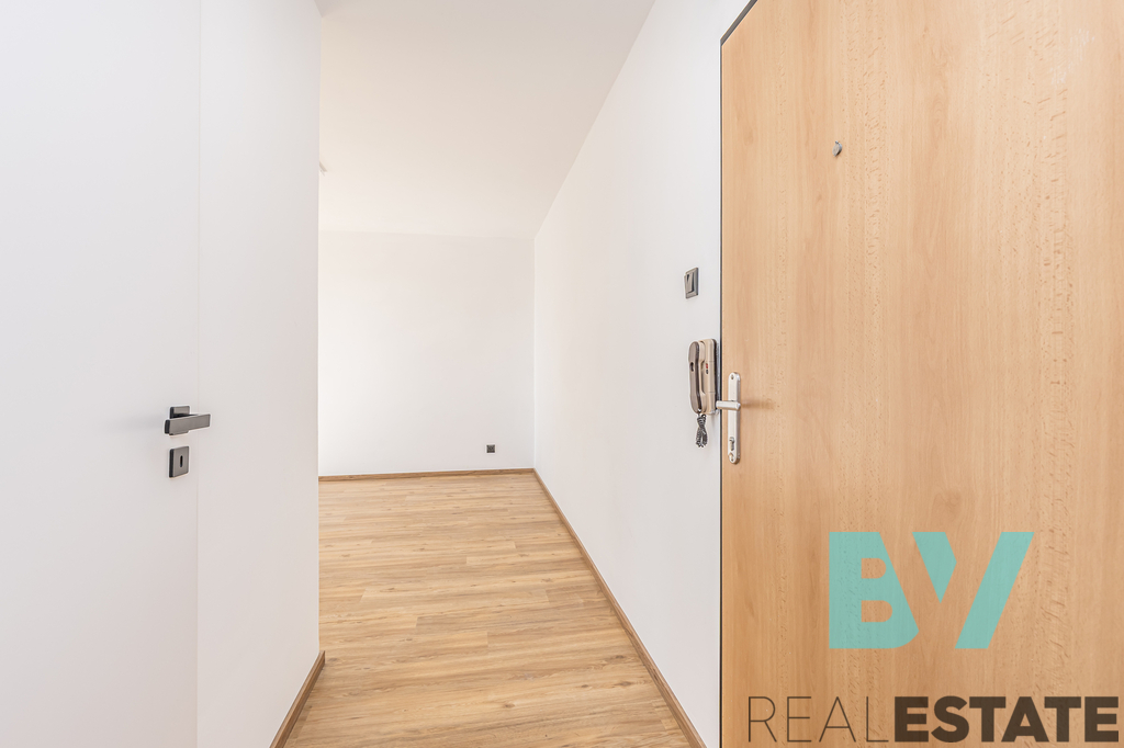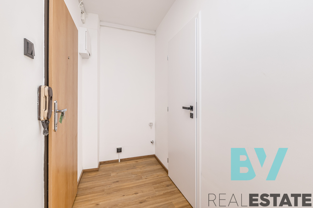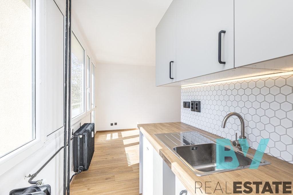 Součástí bytu je nová kuchyňská linka vybavená varnou deskou, troubou, dřezem a lednicí. V celém bytě jsou nové vinylové podlahy v dekoru dřeva. Obytný prostor je díky velkým oknům velmi světlý a příjemný, francouzské okno interiér ještě více otevírá a prosvětluje.