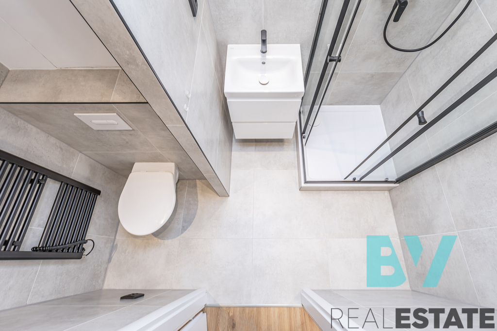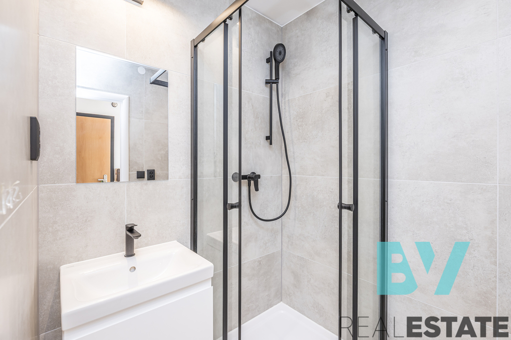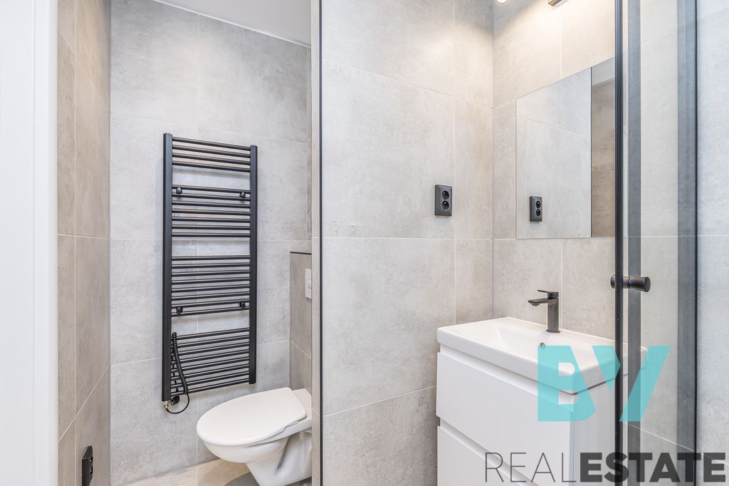 Koupelna je rovněž po kompletní rekonstrukci a nabízí sprchový kout, umyvadlo se skříňkou a toaletu. Celý byt působí svěže, moderně a je vhodný pro jednotlivce nebo pár, kteří hledají bydlení bez nutnosti dalších úprav.