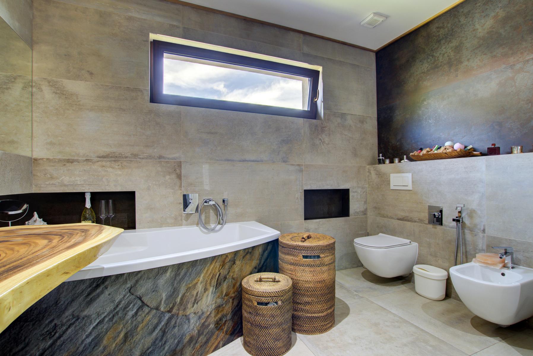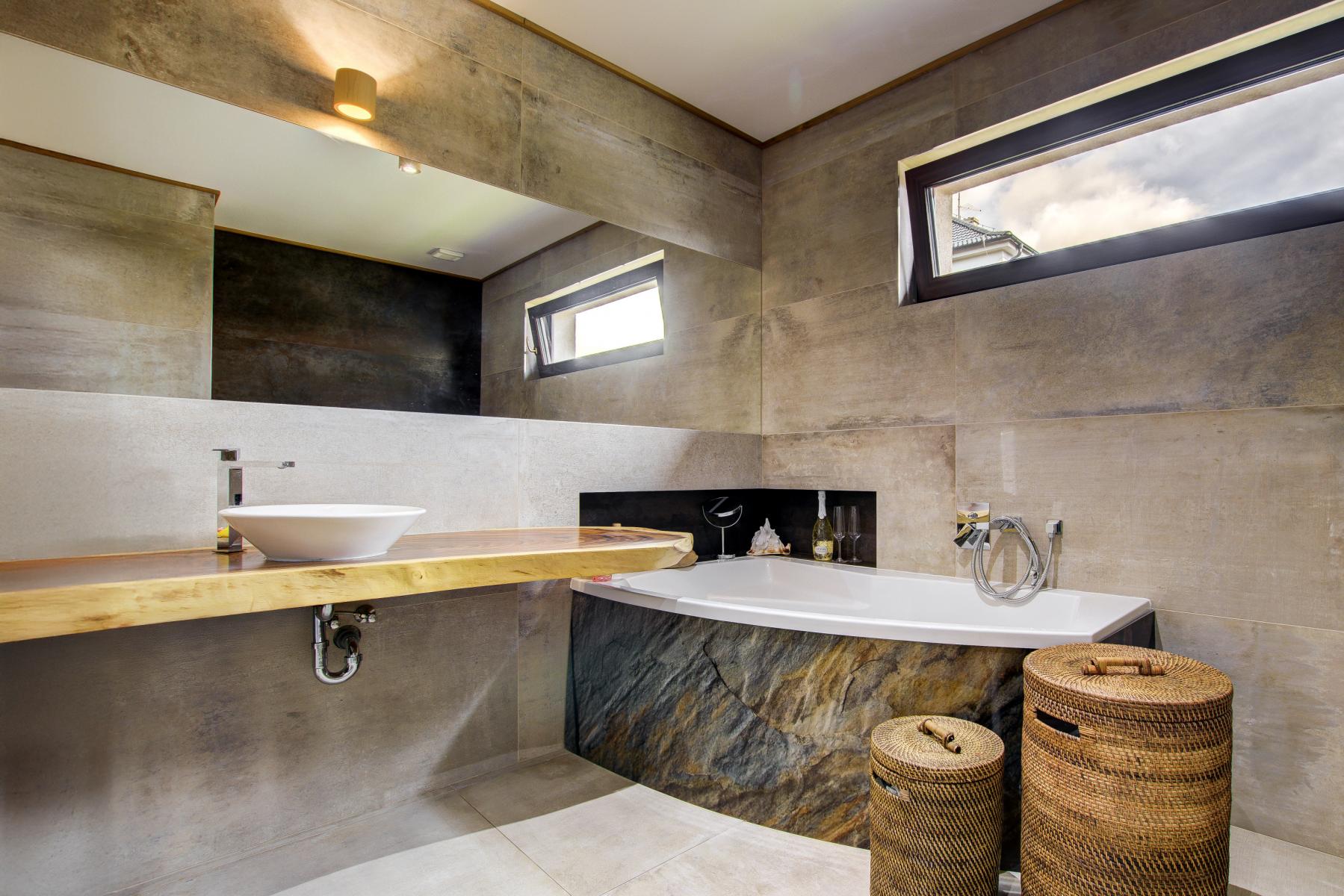 Dále dům nabízí 3 ložnice, šatna, spíž, prostornou koupelnu s vanou, sprchovým koutem, designovým umyvadlovým pultem, bidetem a WC, samostatné WC a technickou místnost s plynovým kondenzačním kotlem Vaillant. Koupelna je vybavena pračkou se sušičkou.