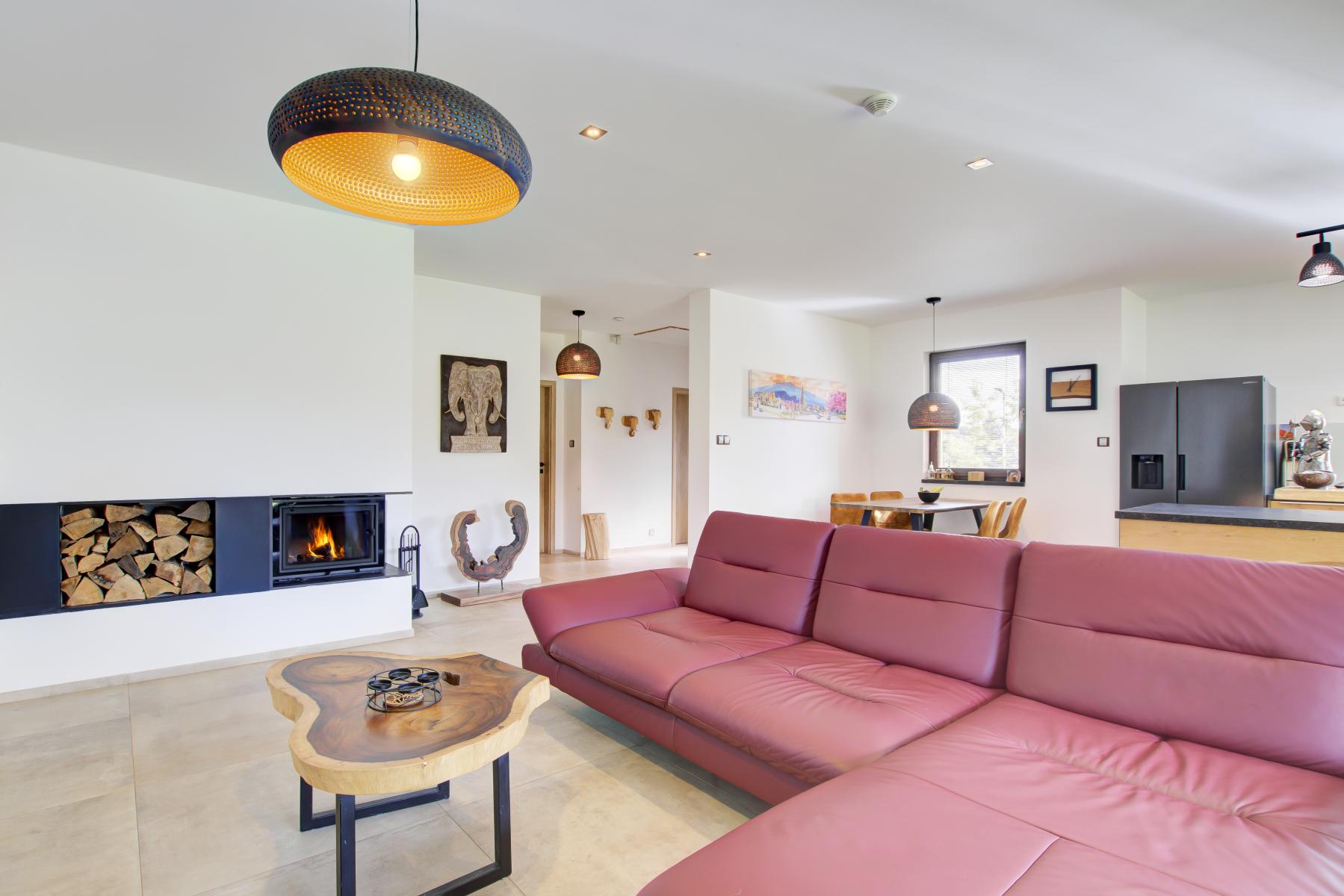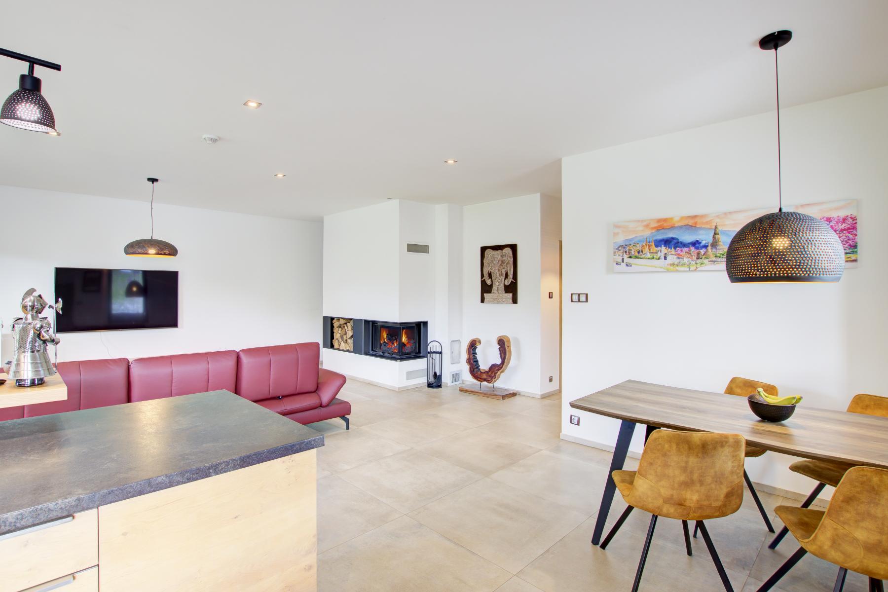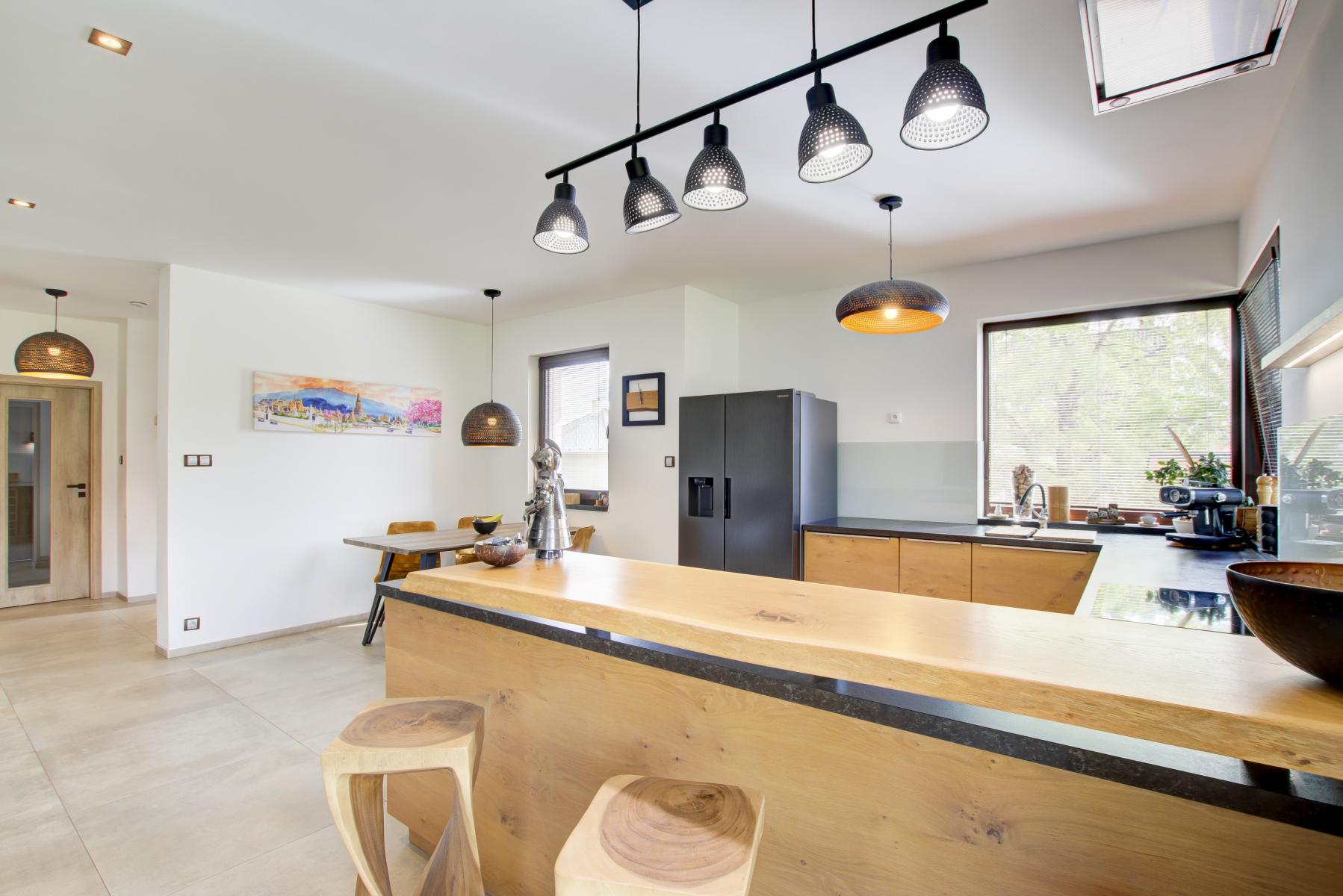 Dominantou domu je velký obývací pokoj s krbem na dřevo a širokými prosklenými dveřmi, které vedou na prostornou terasu (23 m2) a do zahrady. Součástí pokoje je špičková zakázková kuchyně z masivu ve tvaru U s jídelním pultem. Kuchyně je vybavena: