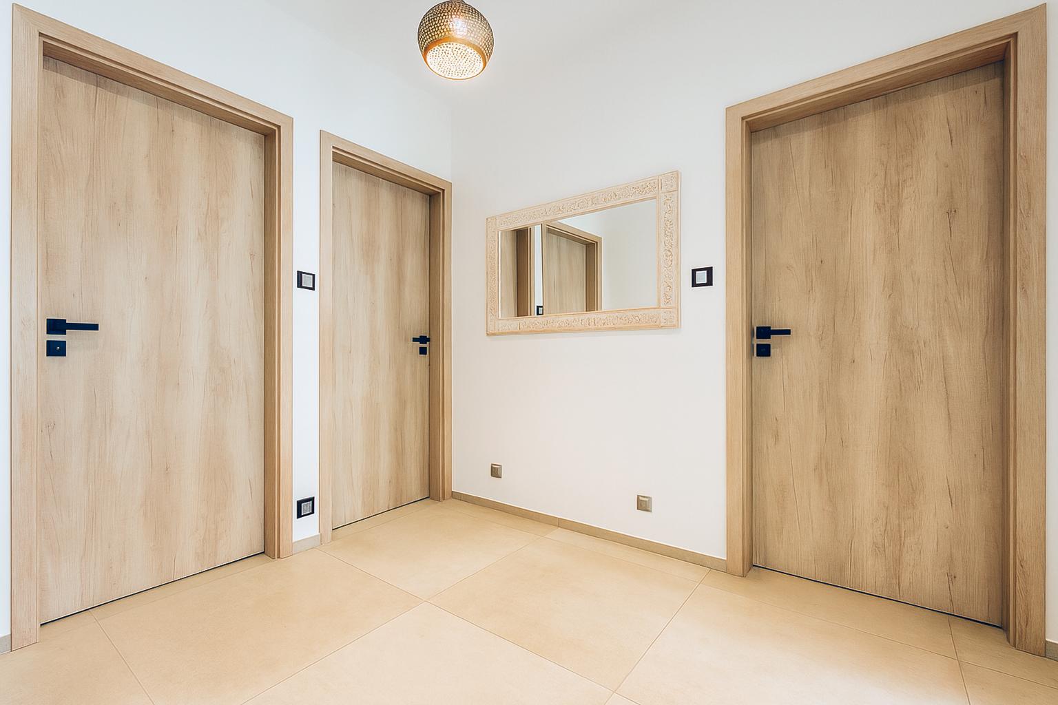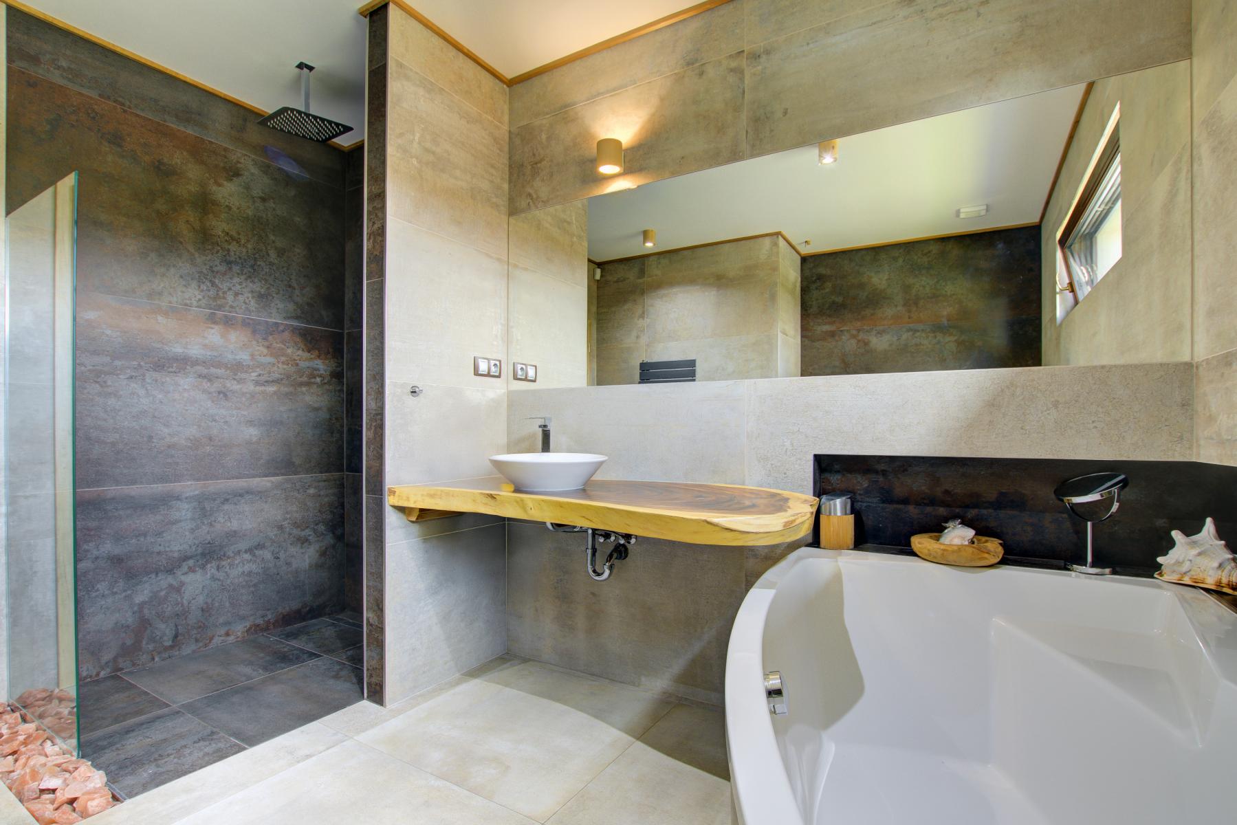V celém domě je jednotná velkoplošná keramická dlažba s podlahovým vytápěním. Spojení industriálního stylu, přírodního dřeva a moderních prvků vytváří jedinečnou a útulnou atmosféru.