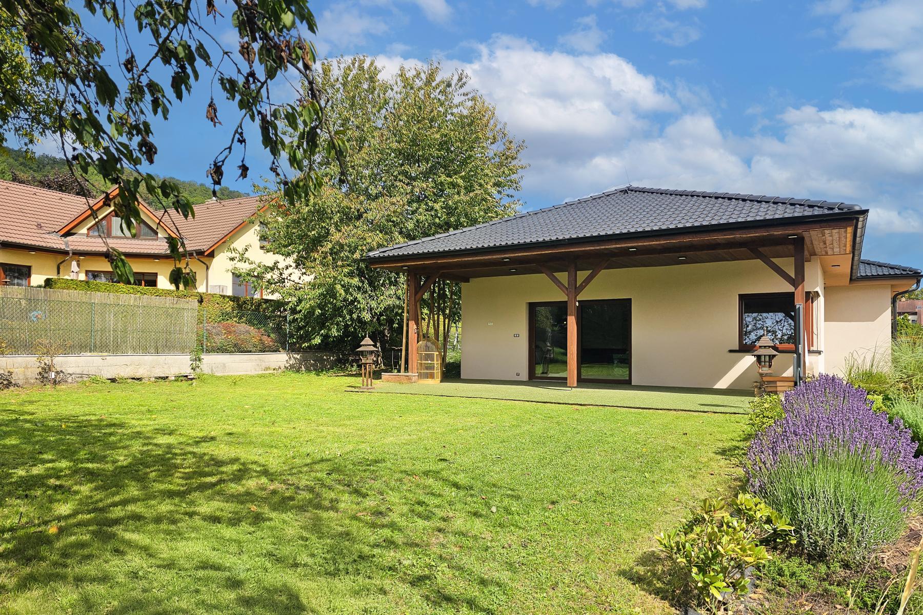 Nabízíme k pronájmu moderní přízemní rodinný dům typu bungalov o velikosti 158 m2, dispozice 4+kk, s krásnou upravenou zahradou o rozloze 1.000 m2.