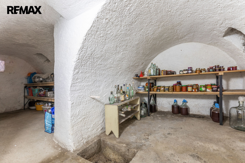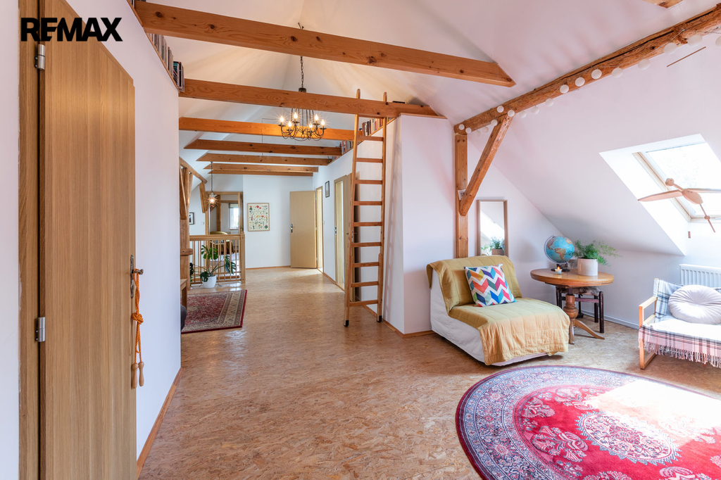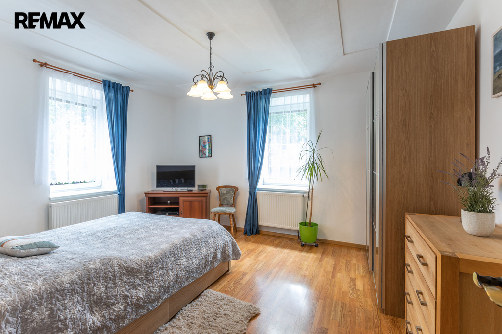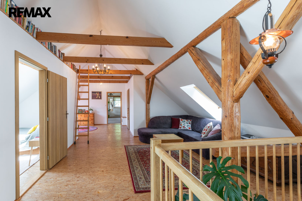 Dům je rozdělen do dvou podlaží. V přízemí najdeme vstupní chodbu, ložnici, koupelnu, kuchyni, krásný prostorný obývací pokoj s krbovými kamny, komoru průchozí do garáže a dva vstupy do dvou sklepů. Patro pak poskytuje prostor pro širokou rodinu, jsou zde dvě menší a dvě skutečně obrovské ložnice, koupelna a společný otevřený prostor mezi všemi místnostmi. Z jedné z větších ložnic je skvělý výhled do krajiny.