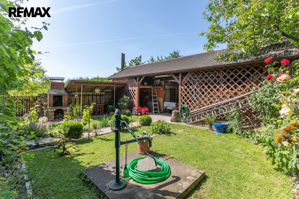 Na zahradu se pohodlně vstupuje z obývacího pokoje přes terasu s posezením, najdeme zde studnu (k zalévání), gril s dalším místem k sezení a kůlnu, kterou protíná druhý vjezd. Parkovat se dá v garáži (momentálně využitá k uskladnění věcí) nebo na vydlážděných místech před vstupem do domu (elektrická brána, pohodlné místo pro dvě auta).