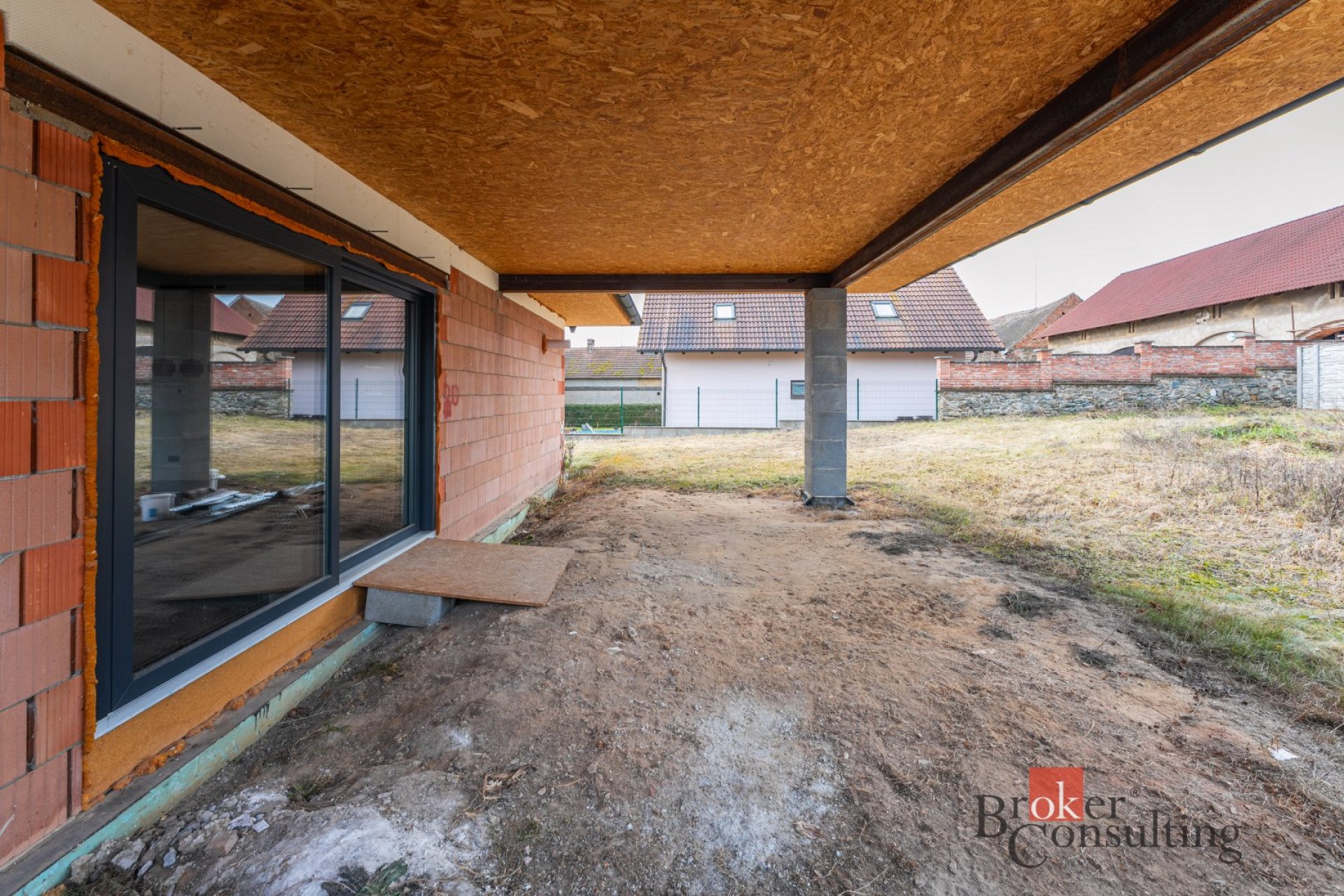 Na obytnou část navazuje zastřešená terasa určená k venkovnímu posezení a odpočinku. V rohu zahrady je připraven vybetonovaný základ pro budoucí zahradní domek.