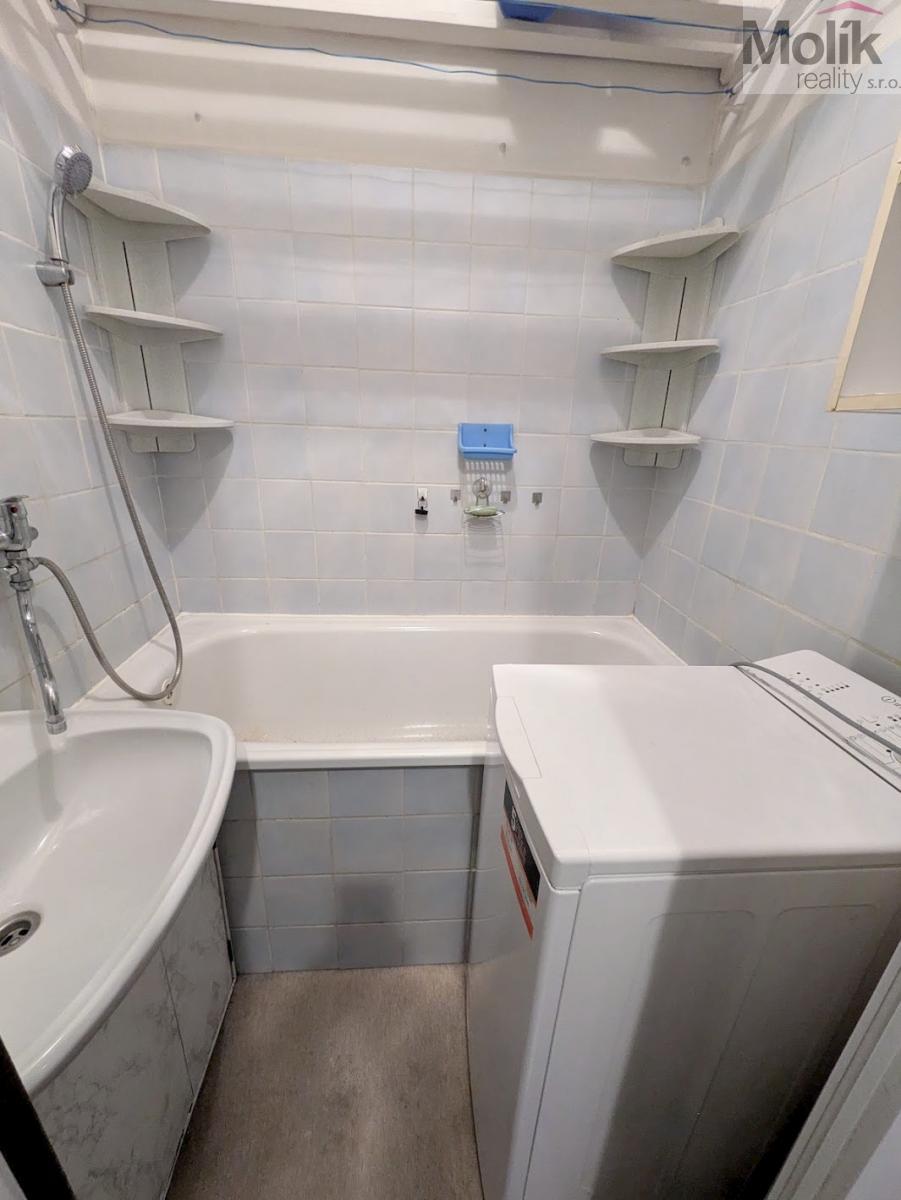 Byt se nachází ve 3. patře (4. nadzemní podlaží bez výtahu) a je v dobrém stavu. Do 14 dnů bude vyměněna vana a opraven a vymalován strop v obývacím pokoji. Součástí nájmu je i zařízení na fotografiích, kuchyňská linka, lednice a pračka.