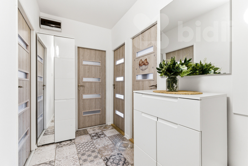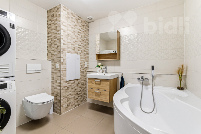 Jednotka je slunná a nabízí příjemný otevřený prostor - obývací pokoj je propojený s kuchyní. Dále zde najdete dva samostatné pokoje, zvětšenou koupelnu s rohovou vanou a místem pro pračku i sušičku. Na chodbě se nachází praktická komora.