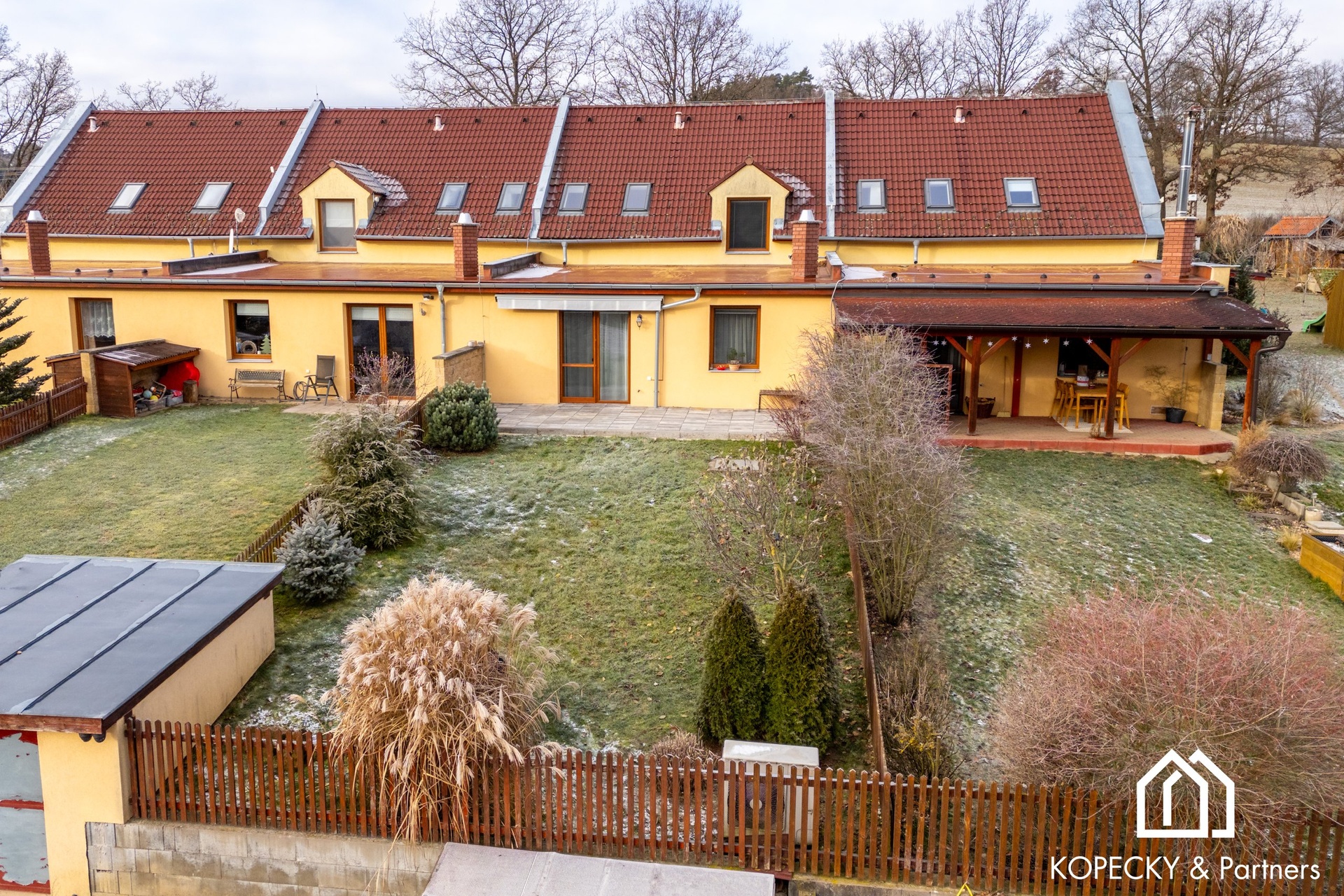 Kuchyňská linka je vybavena spotřebiči, které odpovídají standardu této nemovitosti – myčka nádobí, sklokeramická varná deska, elektrická trouba a mikrovlnná trouba. Na obytnou část navazuje terasa, kde oceníte markýzu na dálkové ovládání. Samozřejmostí je také garáž s vraty na dálkové ovládání. Praktickým bonusem je komora za domem, ideální pro uložení zahradního vybavení, kol, sezónních věcí nebo sportovních potřeb.