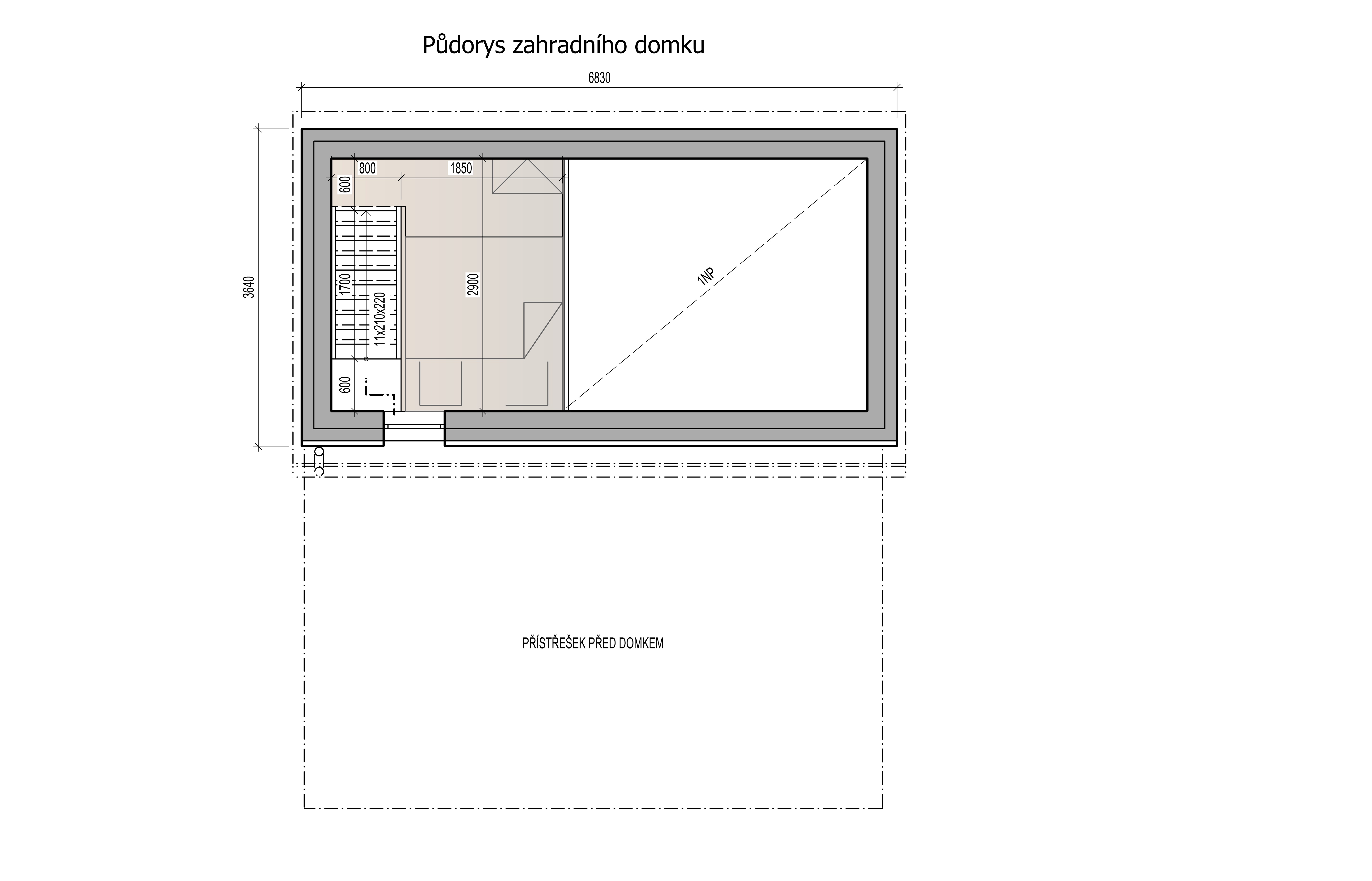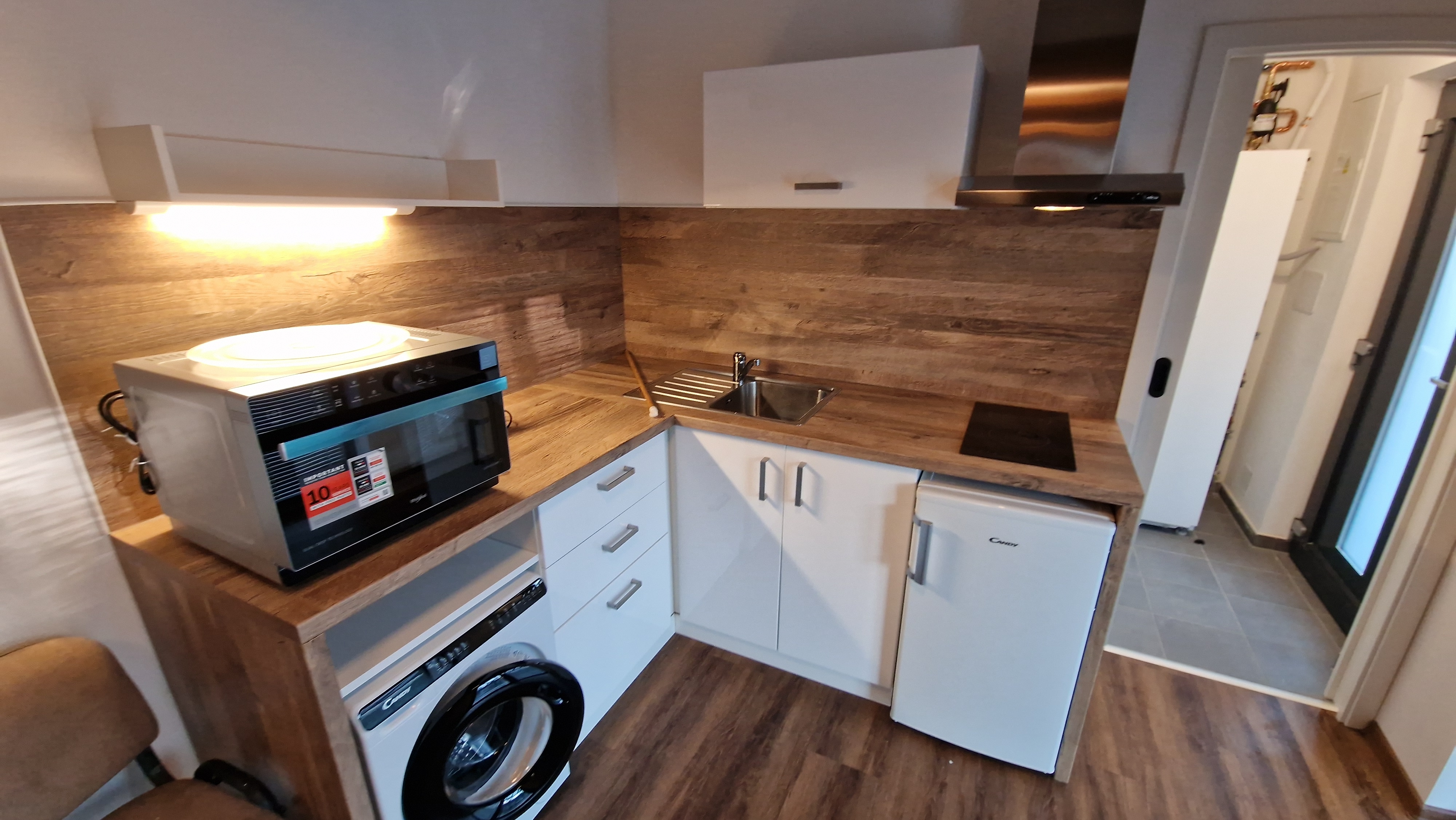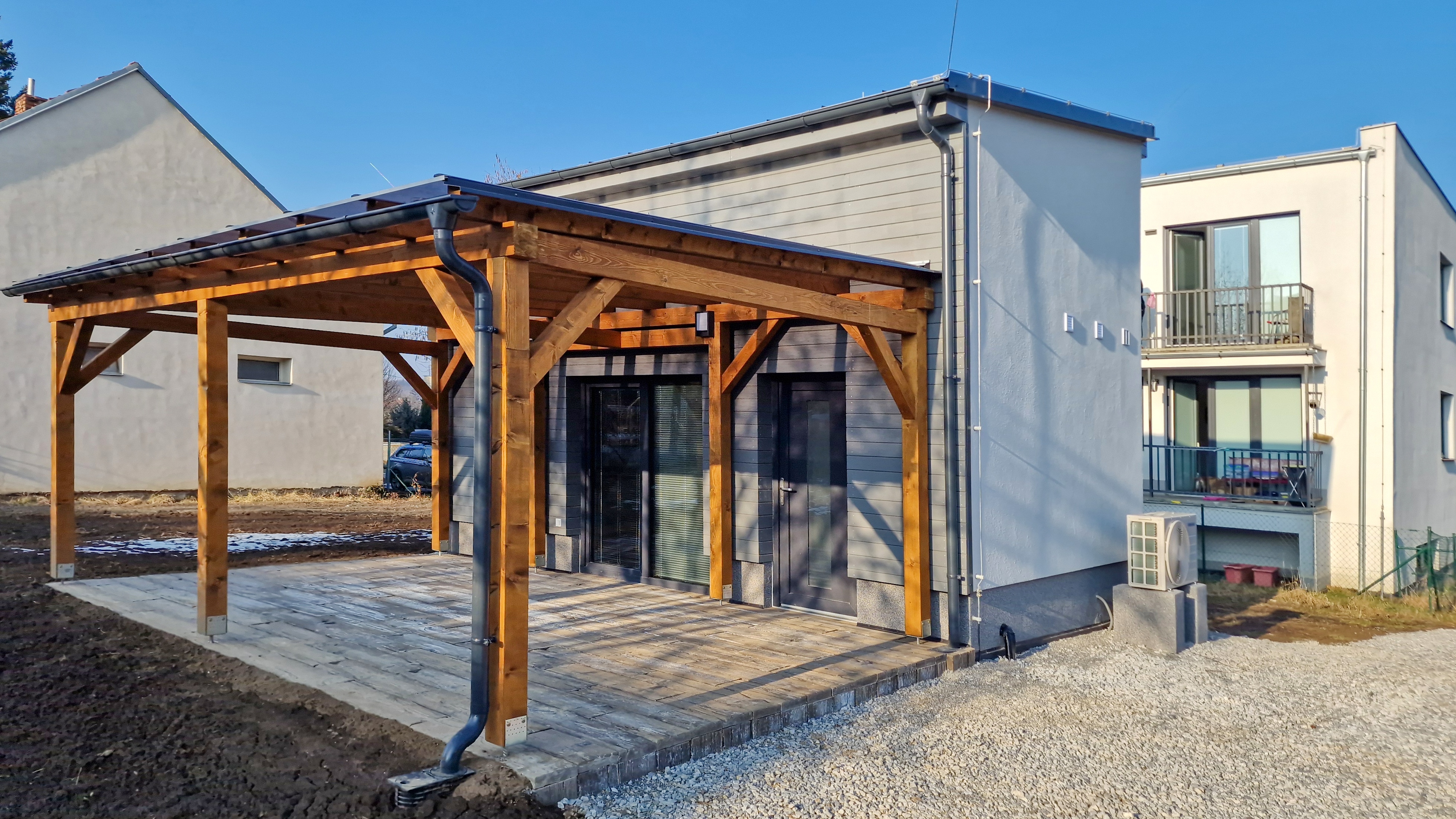 Součástí prodeje ji i novostavba menšího samostatně stojícího domku s krytou terasou o zastavěné ploše 25 m2 v zadní části pozemku. Domek je jakou součást hlavní stavby. Dům je vybaven tepelným čerpadlem pro vytápění a ohřev vody, koupelnou se sprchovým koutem, WC a umyvadlem. Kuchyňská linka včetně spotřebičů. Spaní je řešeno v podkrovní části domku s dřevěnou vestavěnou palandou.