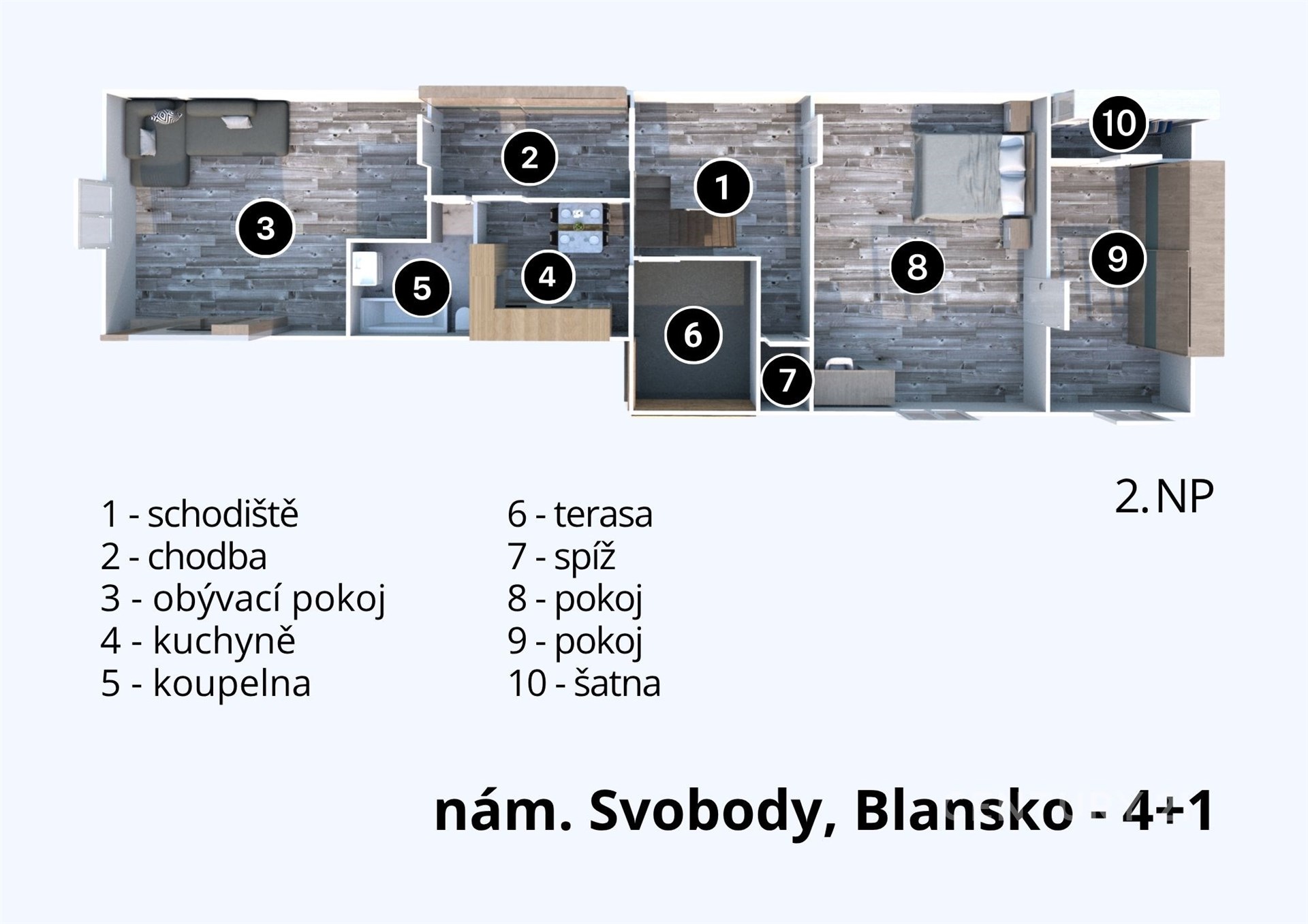 Nabízím dvoupodlažní byt, charakterem odpovídající rodinnému domu, s dispozicí 4+1 o ploše cca 123 m², který svým zázemím i uspořádáním odpovídá rodinnému domu – přímo na náměstí Svobody v Blansku.