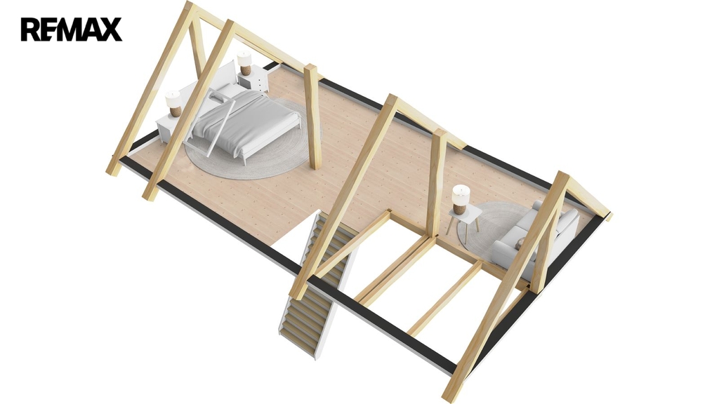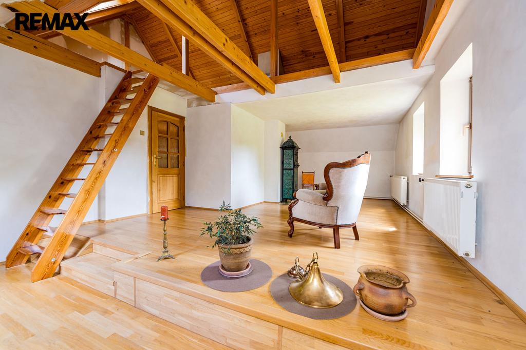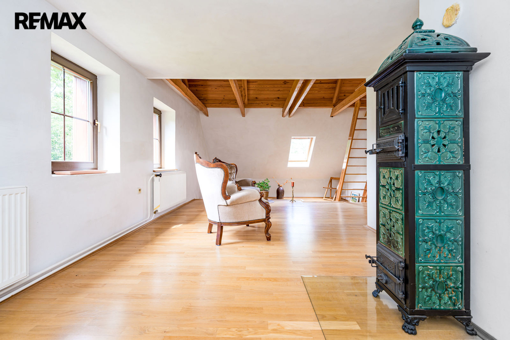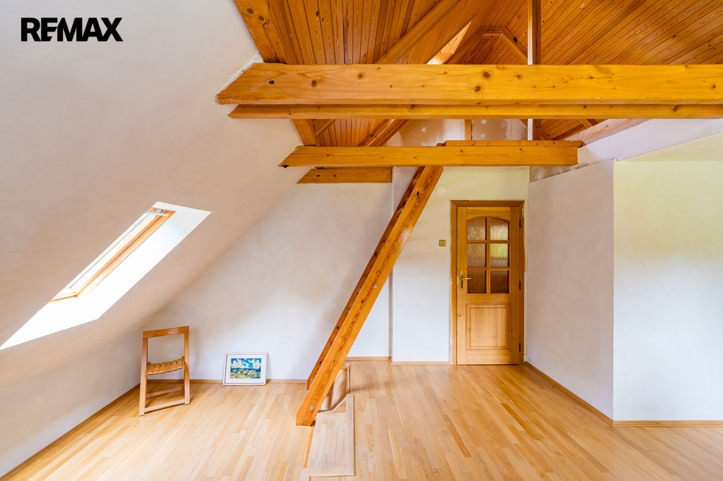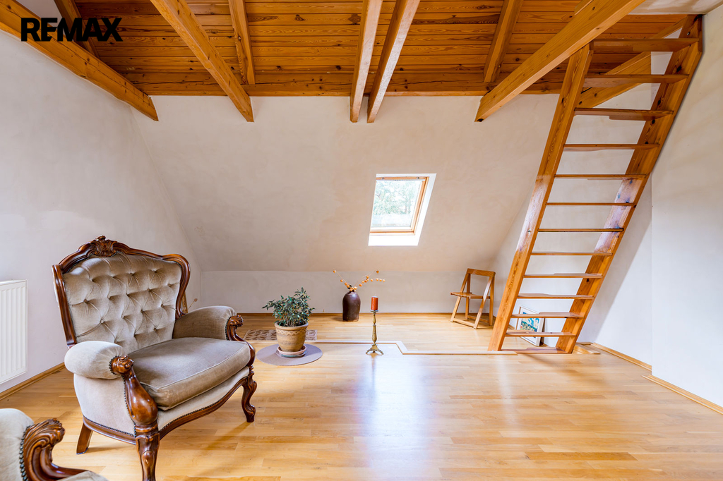 V podkroví se nacházejí tři místnosti s možností využití pro další obytný prostor pod střechou. Vytápění je ústřední pomocí kotle na tuhá paliva a lokálními krbovými kamny v obývacím pokoji. Teplou vodu zajišťuje elektrický bojler. Nemovitost je napojena na elektřinu, vodu z vlastní studny a kanalizace je svedena do septiku.