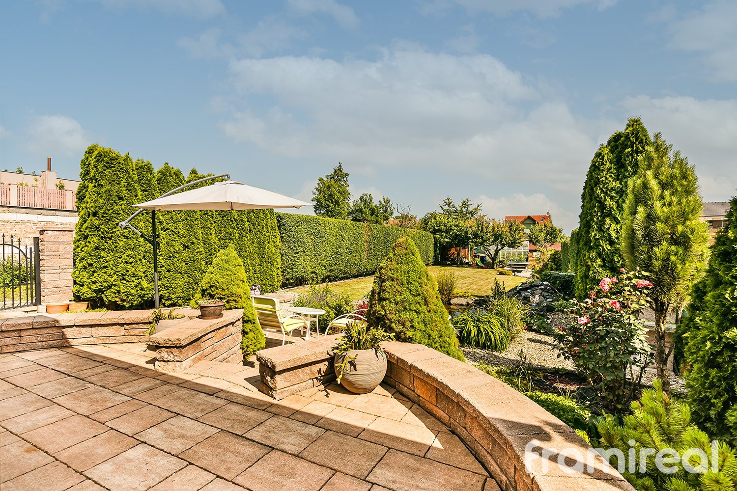 Zahrada je osázena vzrostlými dřevinami a nabízí dostatek soukromí i klidu. Nachází se zde jezírko s rybami, vlastní studna a dva plodící ovocné stromy. Na pozemku je zároveň dostatek místa pro parkování několika vozidel.
