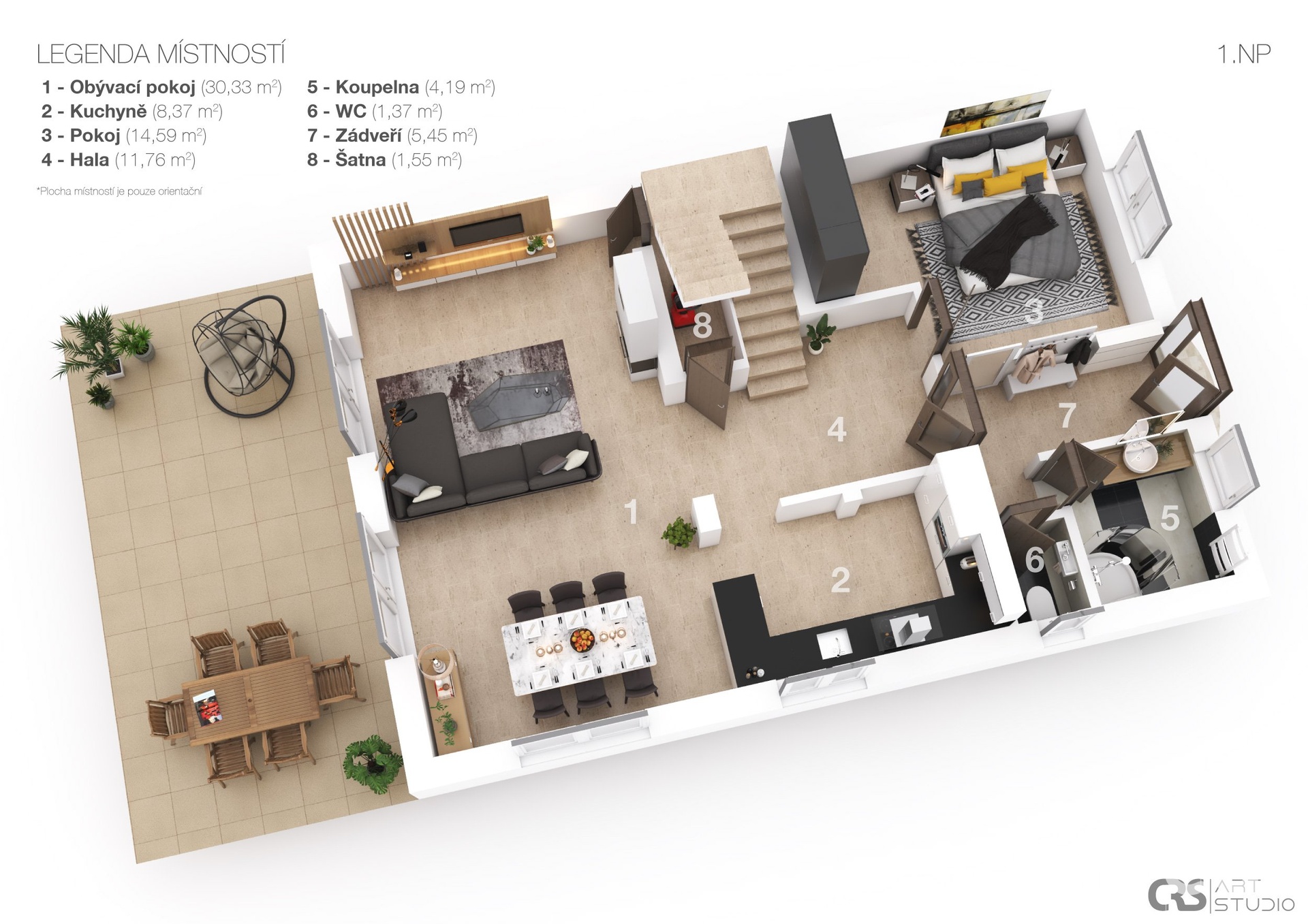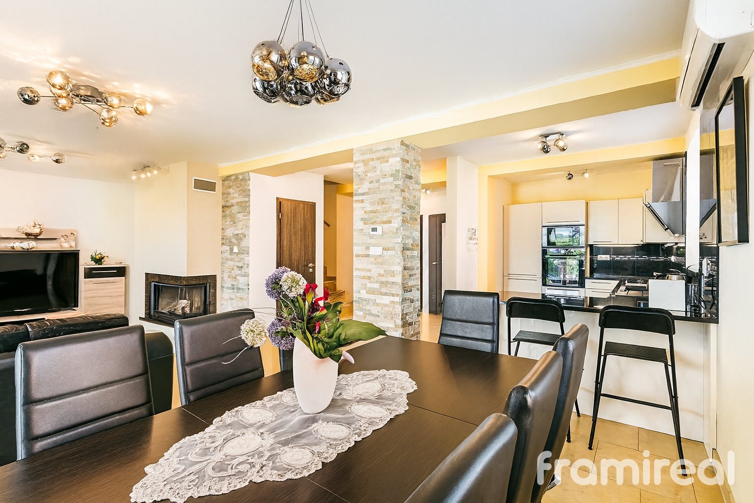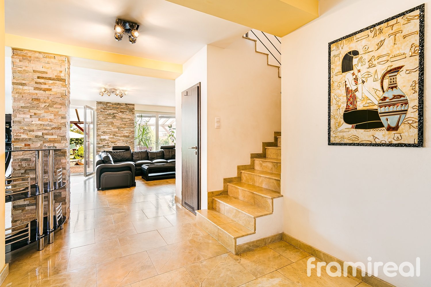 V přízemí se nachází obývací pokoj s krbem a klimatizací, propojený s kuchyňským koutem a jídelnou. Podlahové vytápění v kombinaci s mramorovou dlažbou zajišťuje příjemnou teplotu i v chladnějších dnech.